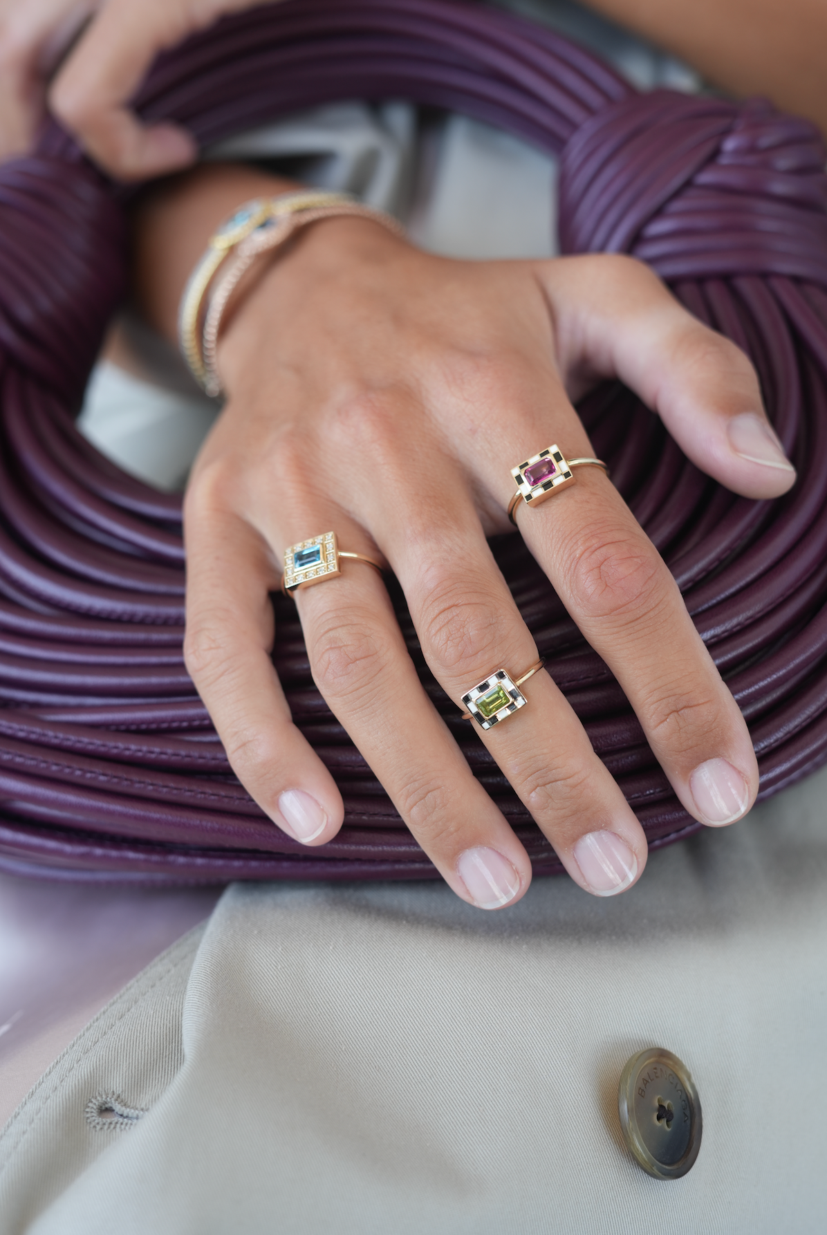 "Mini Chess" Collection 14k gold ring with black and white enamel frame and pink topaz central stone.