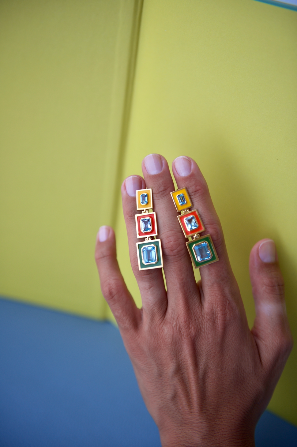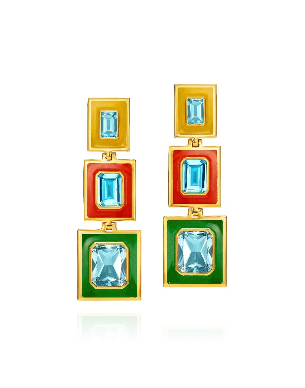 18k gold enamel earrings with blue topaz central stones, yellow, orange and green enamel.