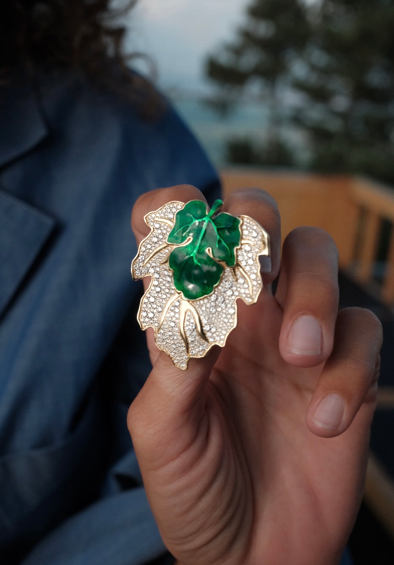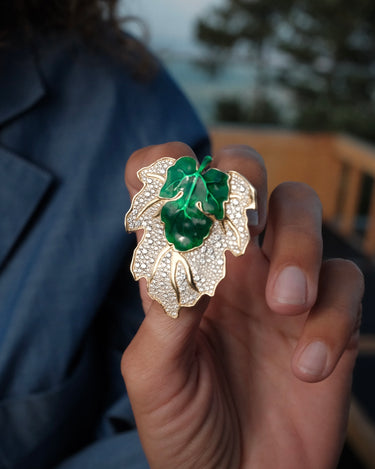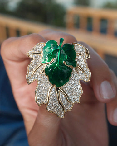 Playful, powerful, and undeniably elegant, the Hide n Seek Ready 2 Lead On brooch captures the spirit of nature through luxury craftsmanship. Sculpted in 18k yellow gold, its bold leaf motif is adorned with 3.44 carats of brilliant white diamonds, flowing like dew across its surface. At the center, a vibrant green enamel overlay adds depth and contrast, creating a wearable piece of art that balances whimsy and authority. Whether worn on a lapel or as a statement pin, this brooch brings organic beauty and commanding style together effortlessly.