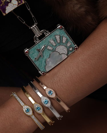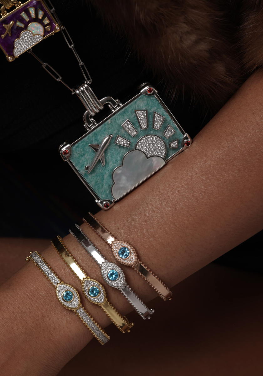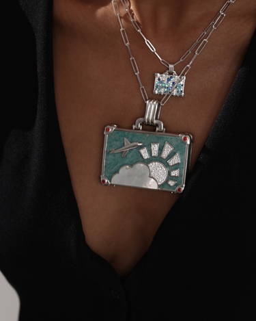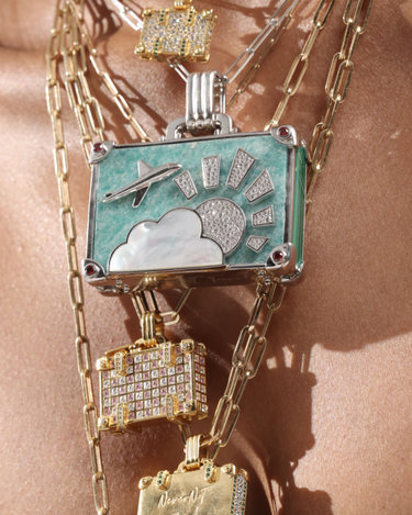 ‘Game Changer’ XL suitcase in 14k white gold with diamond pave sun, Amazonite central stone, malachite sides, pink sapphires, and white mother of pearl cloud.