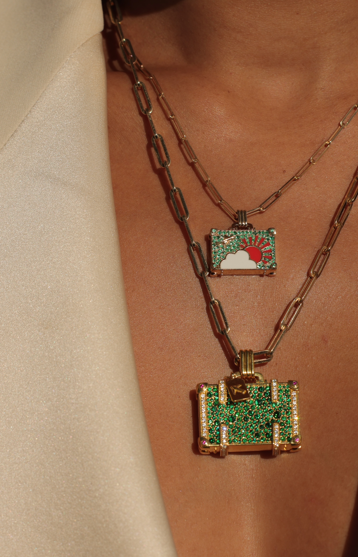 ‘Globetrotter’ 14K yellow gold large suitcase with emerald pave and diamonds.