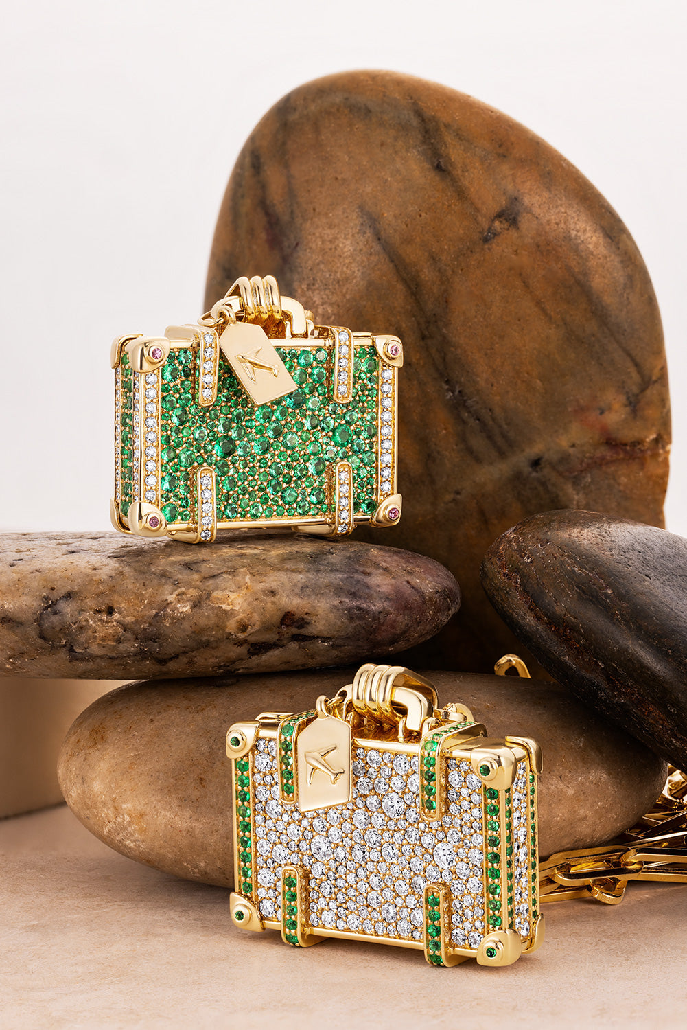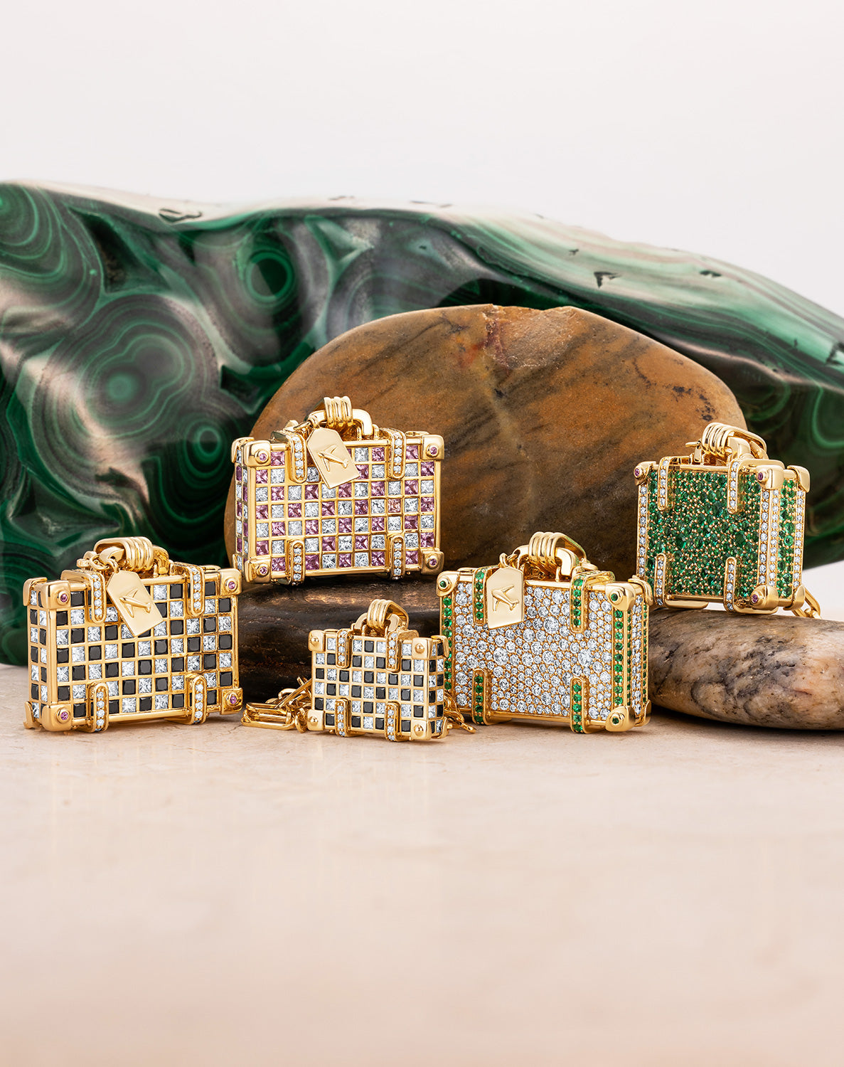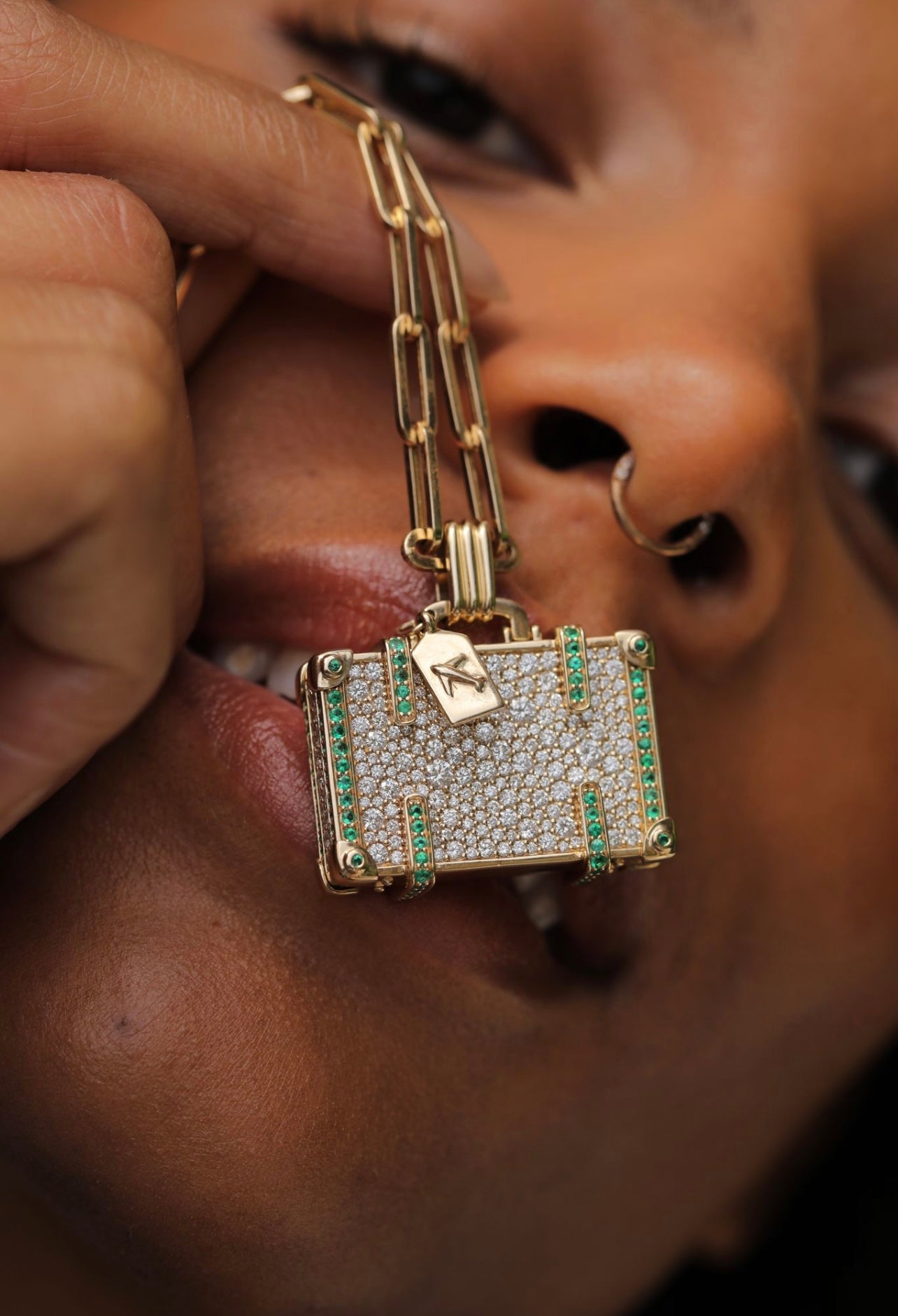 ‘Big Shot’ 14K yellow gold large suitcase with diamond pave and emeralds.