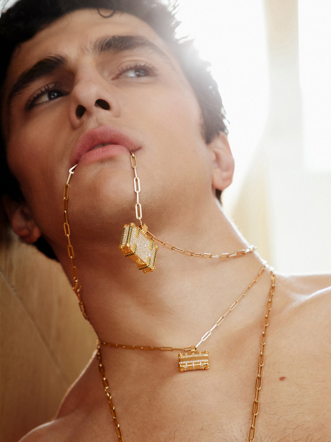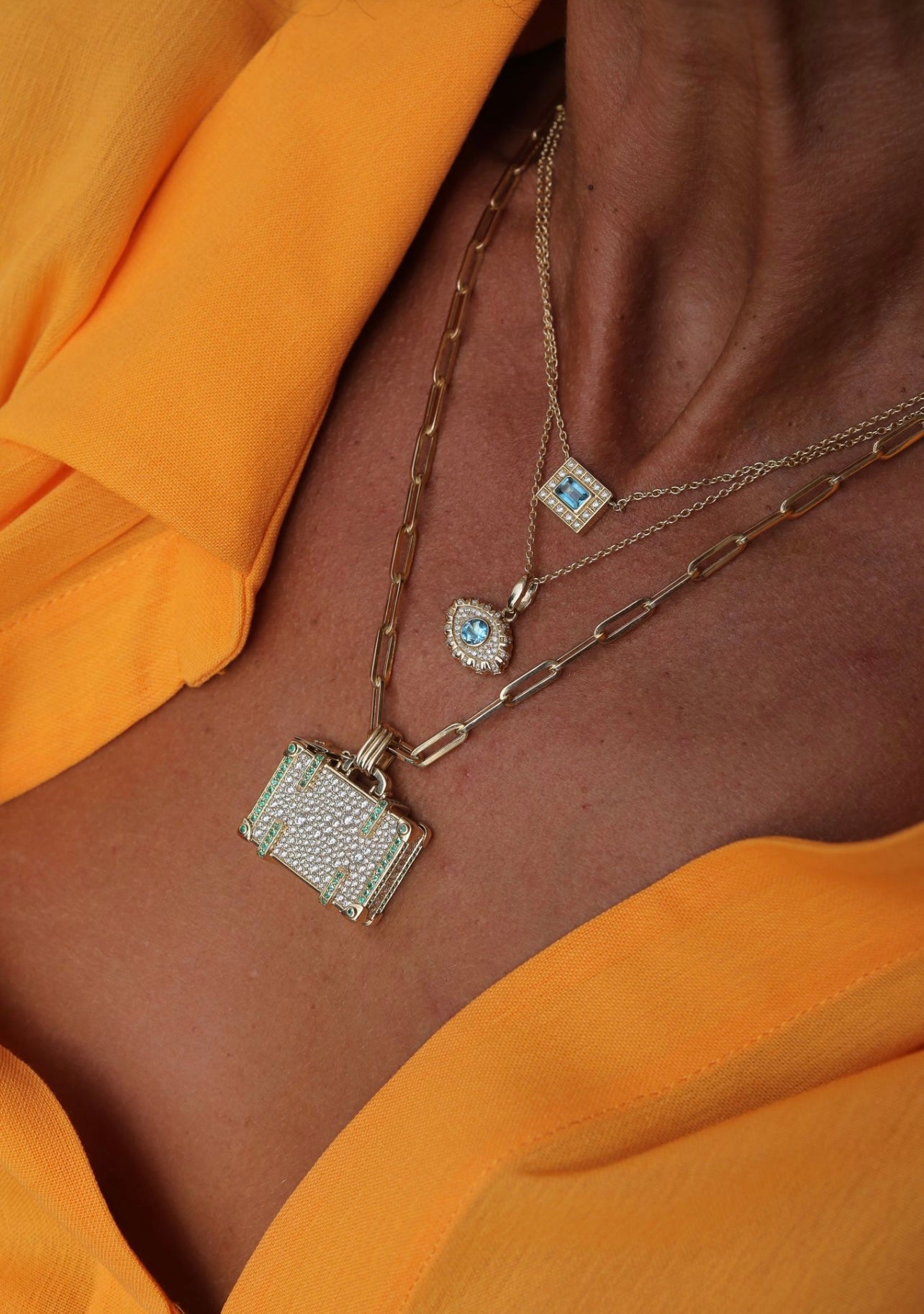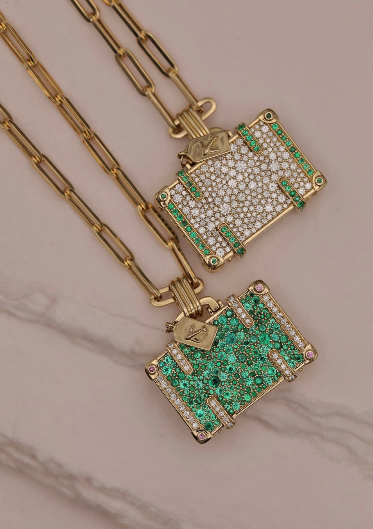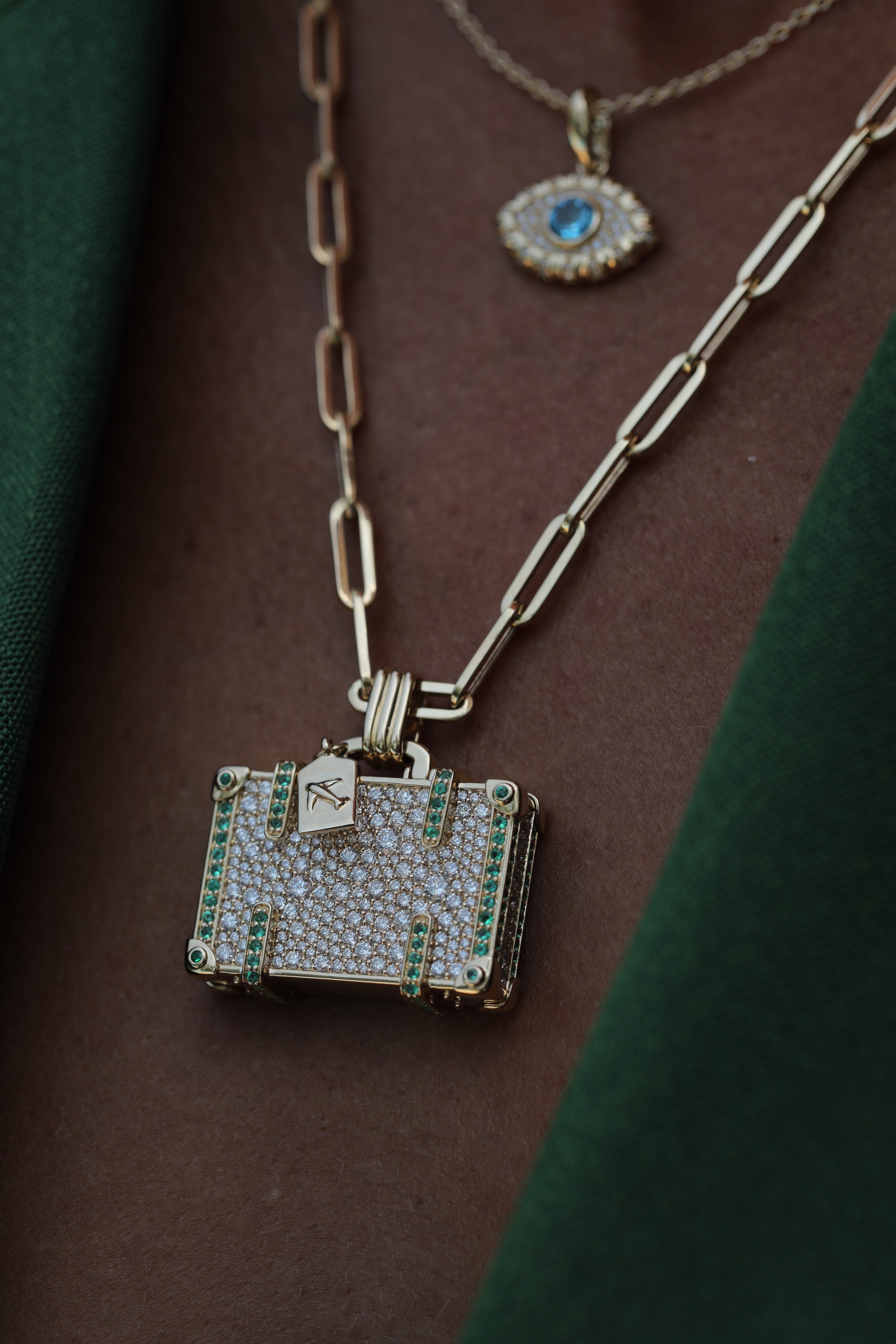 ‘Big Shot’ 14K yellow gold large suitcase with diamond pave and emeralds.