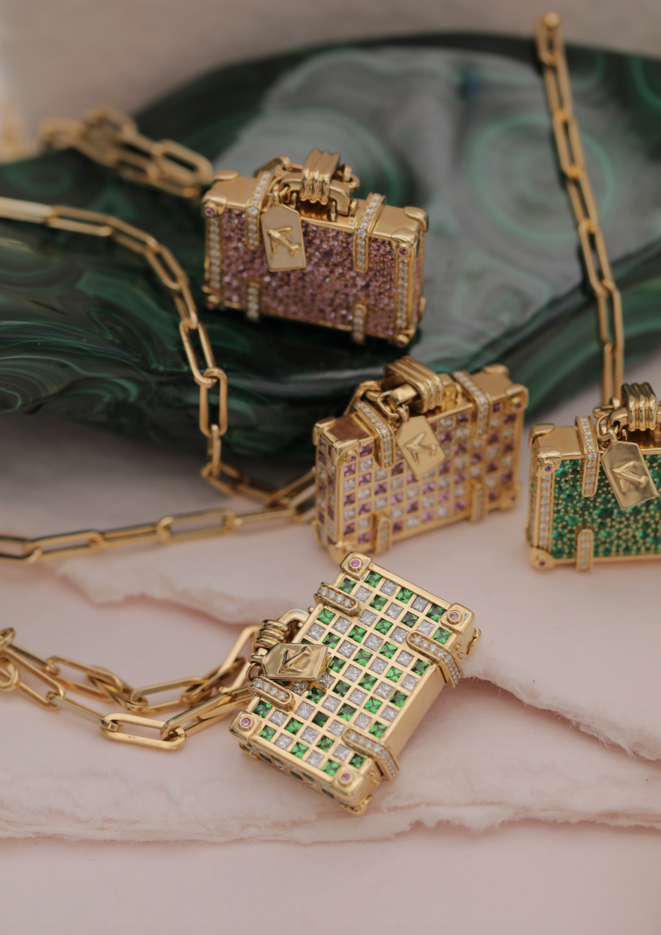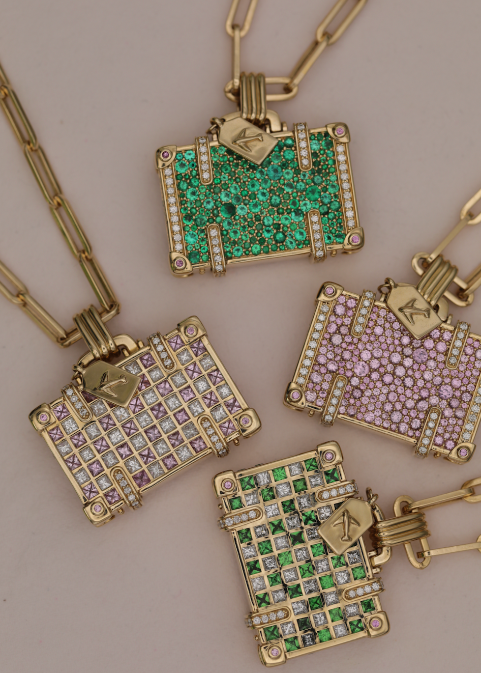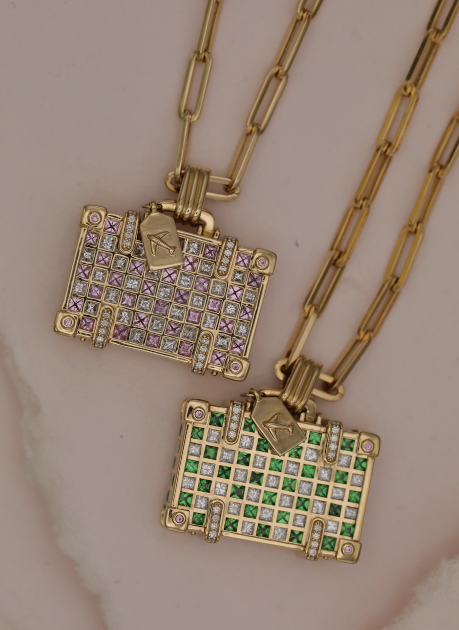 ‘Jet, Set, Go’ 14K yellow gold large suitcase with diamonds, tsavorites and pink sapphires.