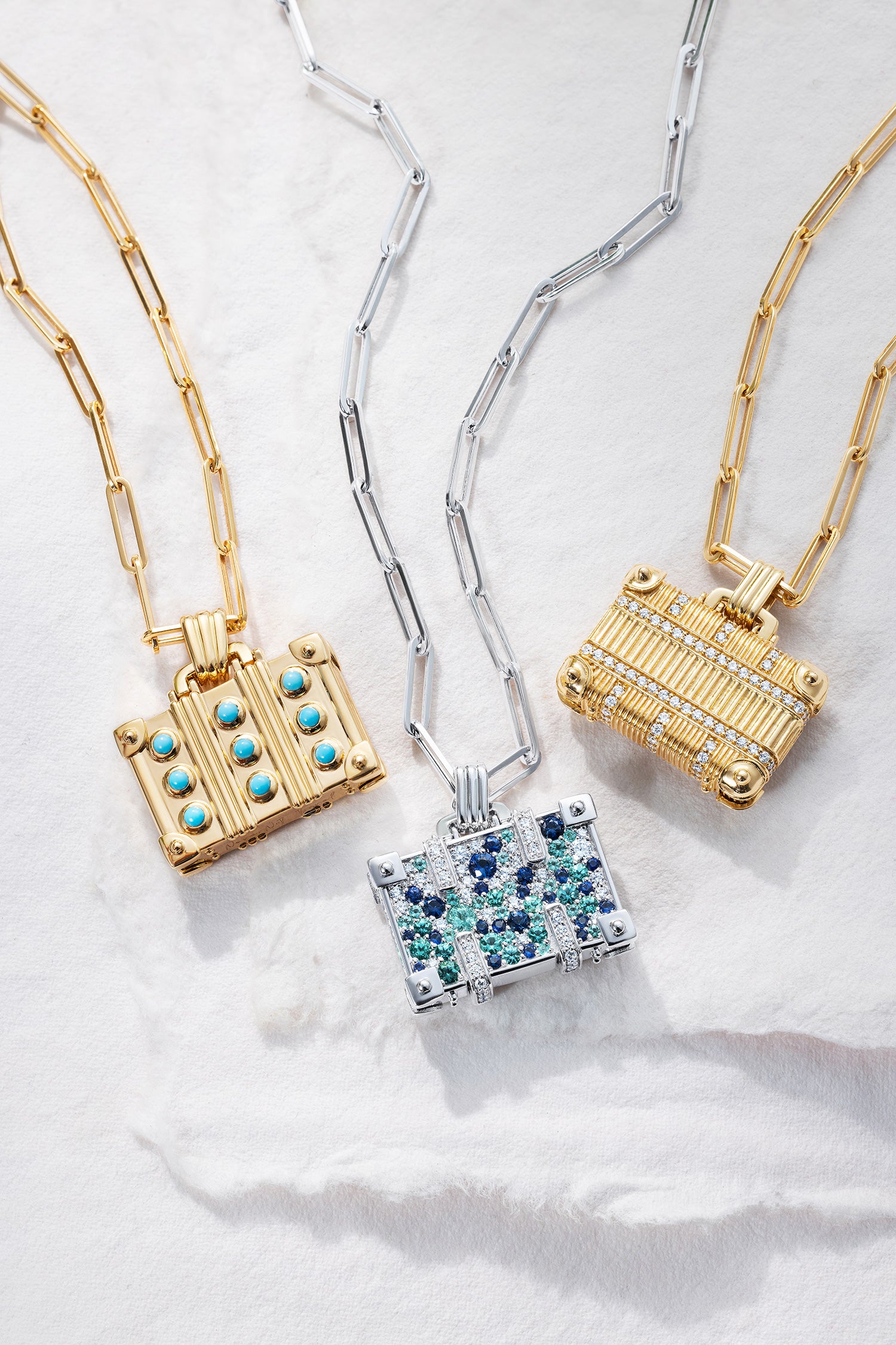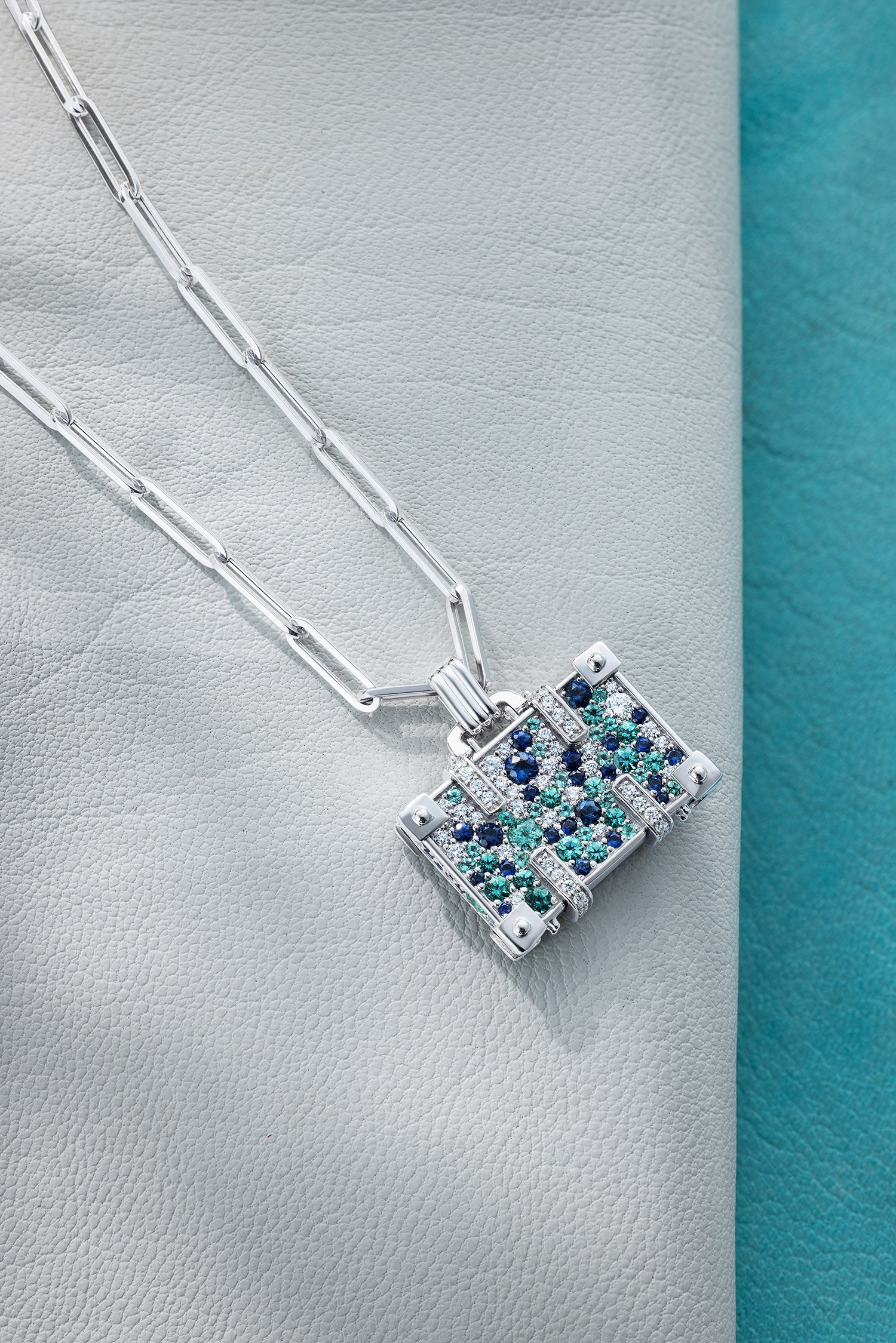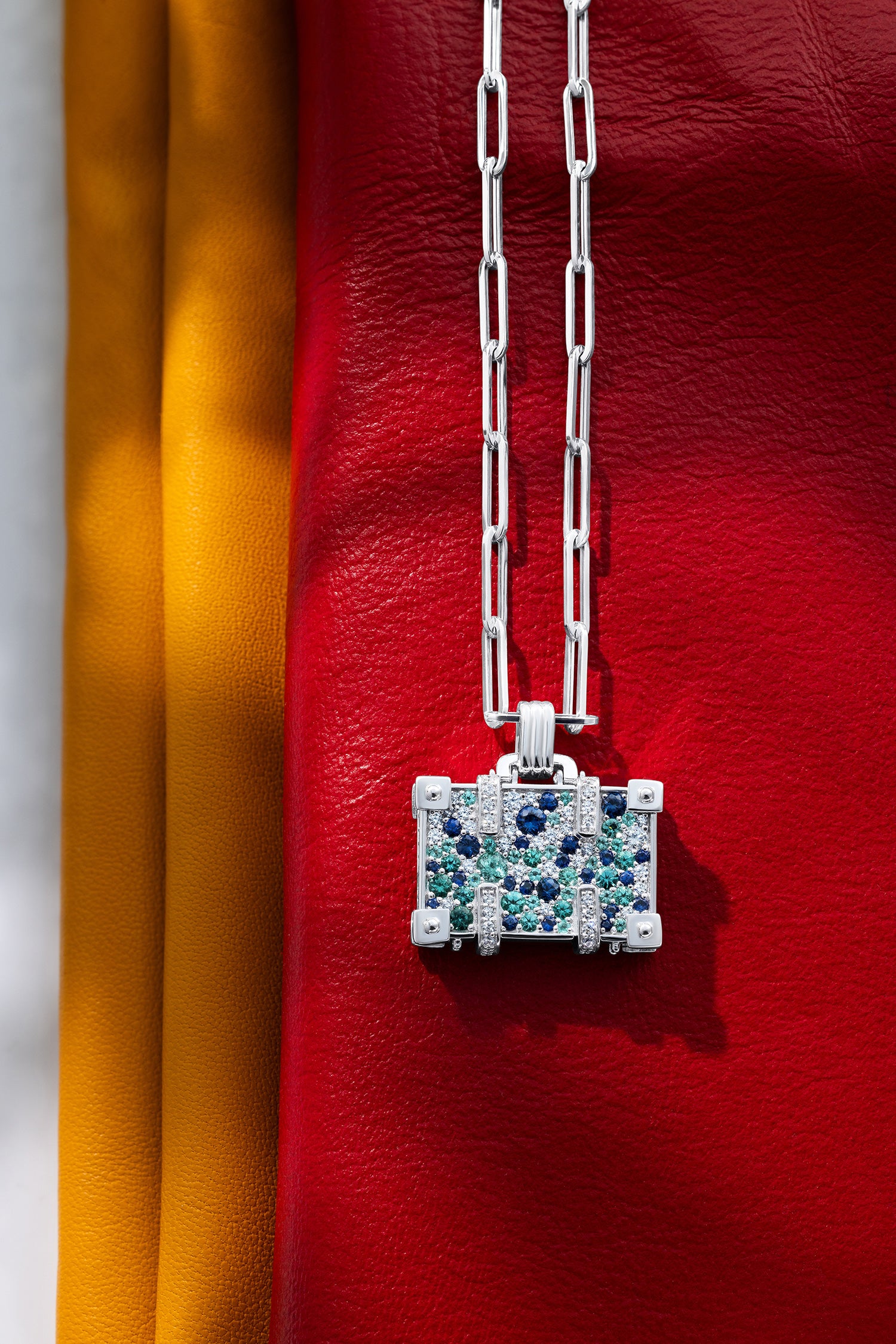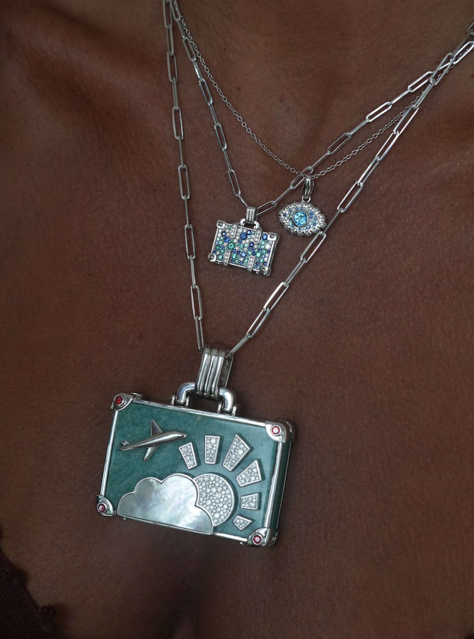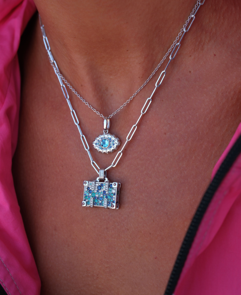 The NeverNoT Travel pendant is a love letter to ocean escapes and vibrant destinations. Crafted in 14K white gold, this petite suitcase shimmers with 0.57 ct paraiba, 0.67 ct blue sapphires, and 0.45 ct white diamonds, capturing the spirit of tropical waters in gem form. Suspended on a 42 cm chain, it’s a striking yet playful accessory for those who always have their next journey in mind.
