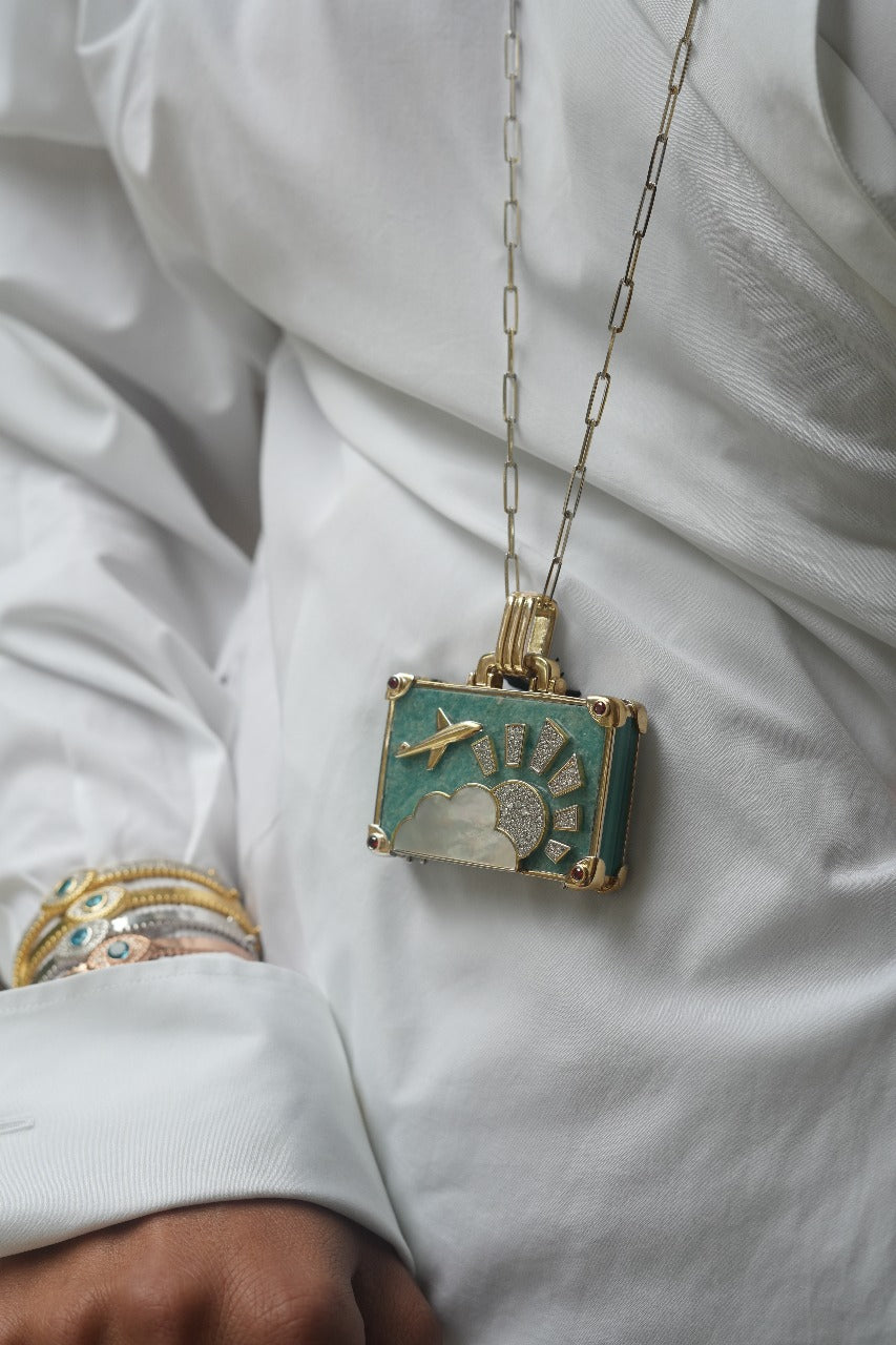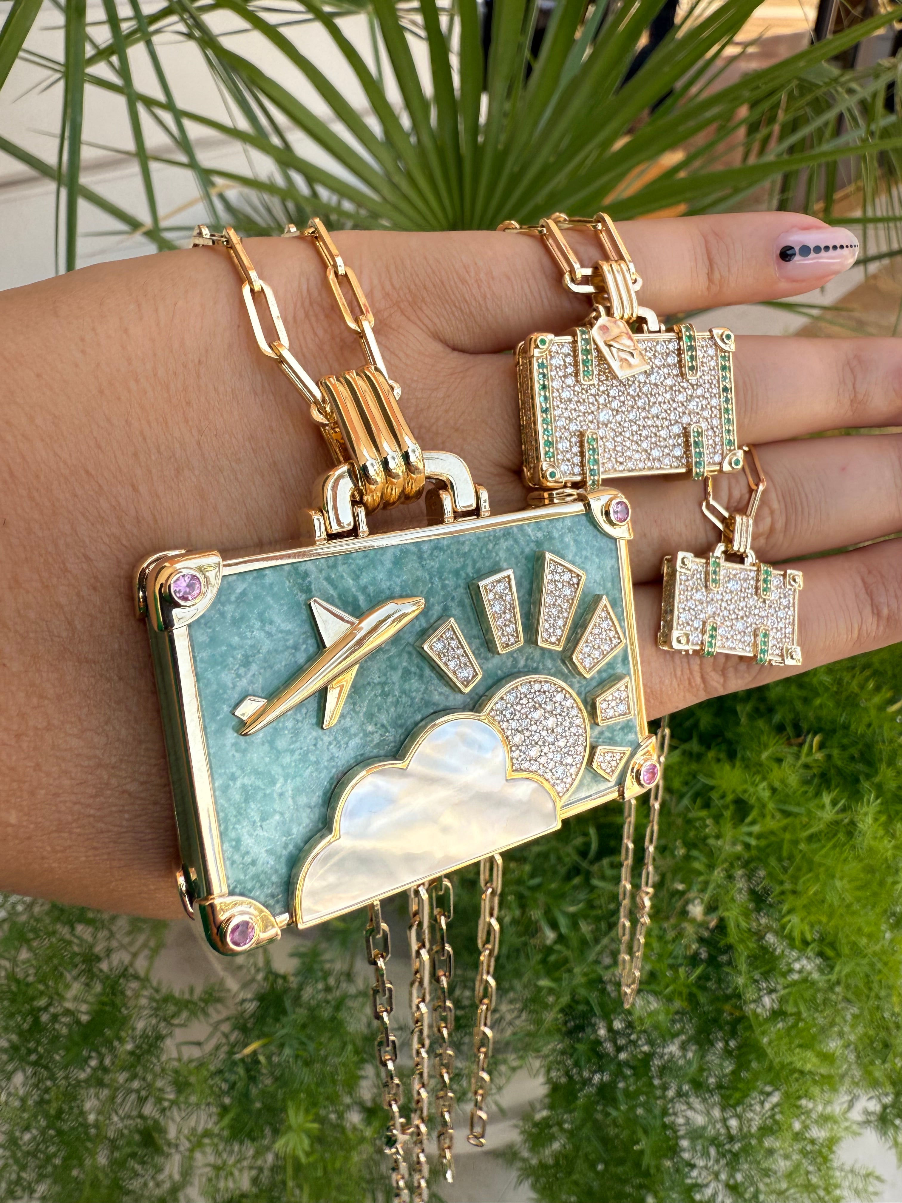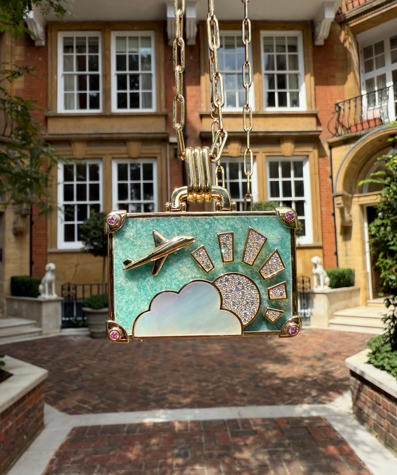 ‘Game Changer’ XL suitcase in 14k yellow gold with diamond pave sun, Amazonite central stone, malachite sides, pink sapphires, and white mother of pearl cloud.