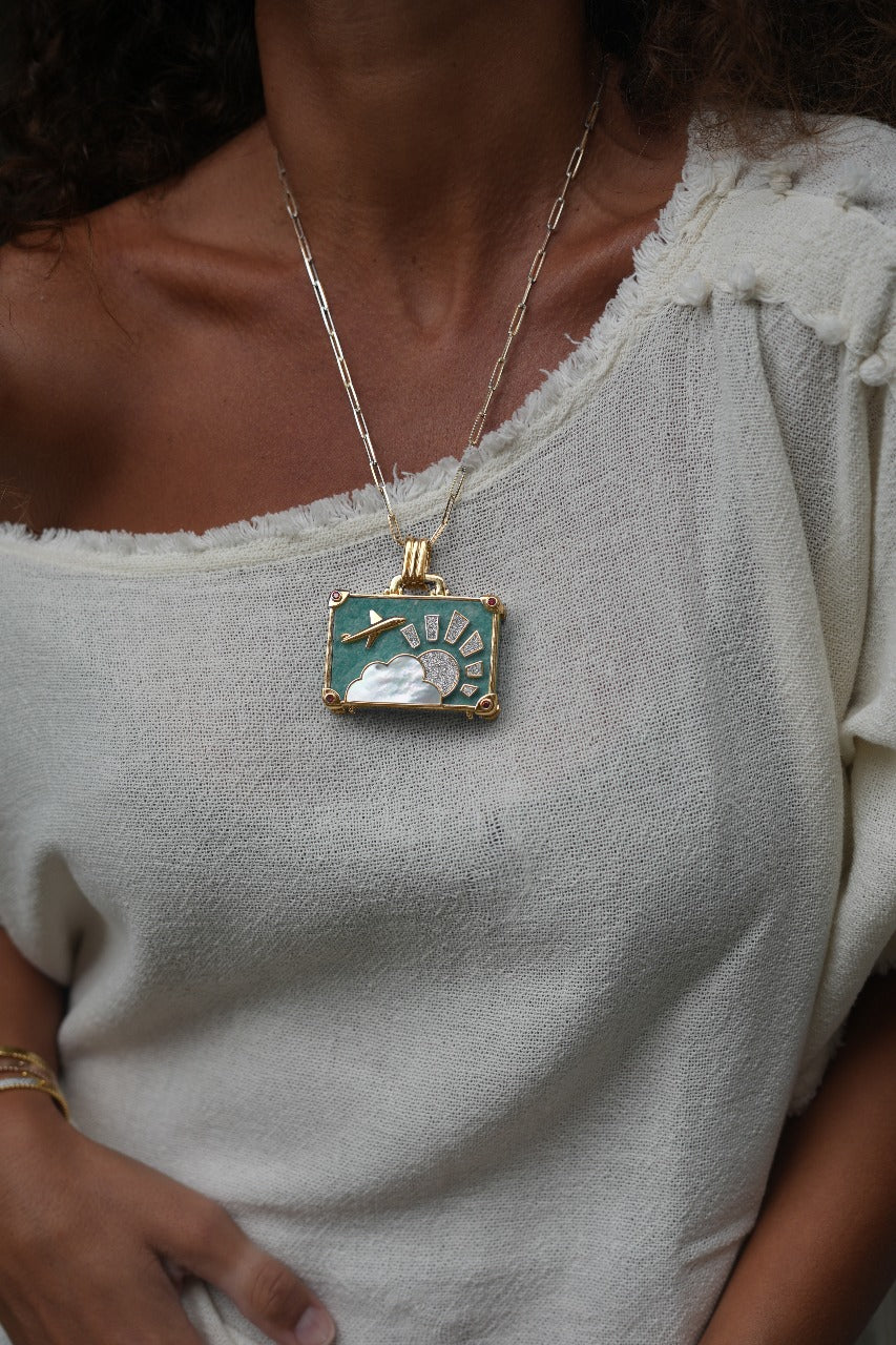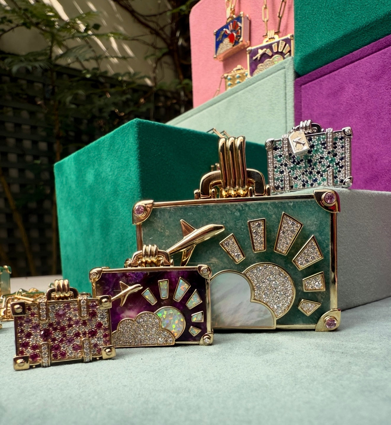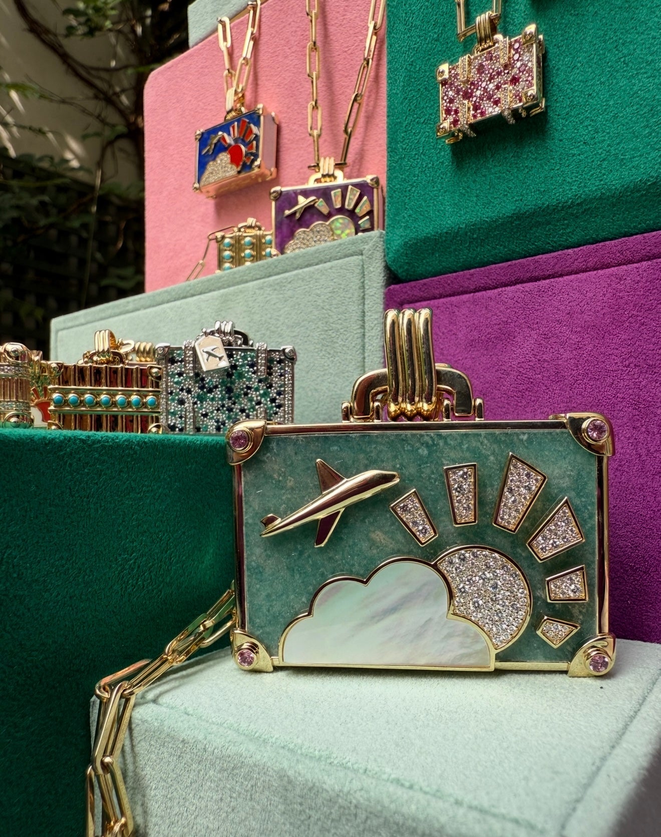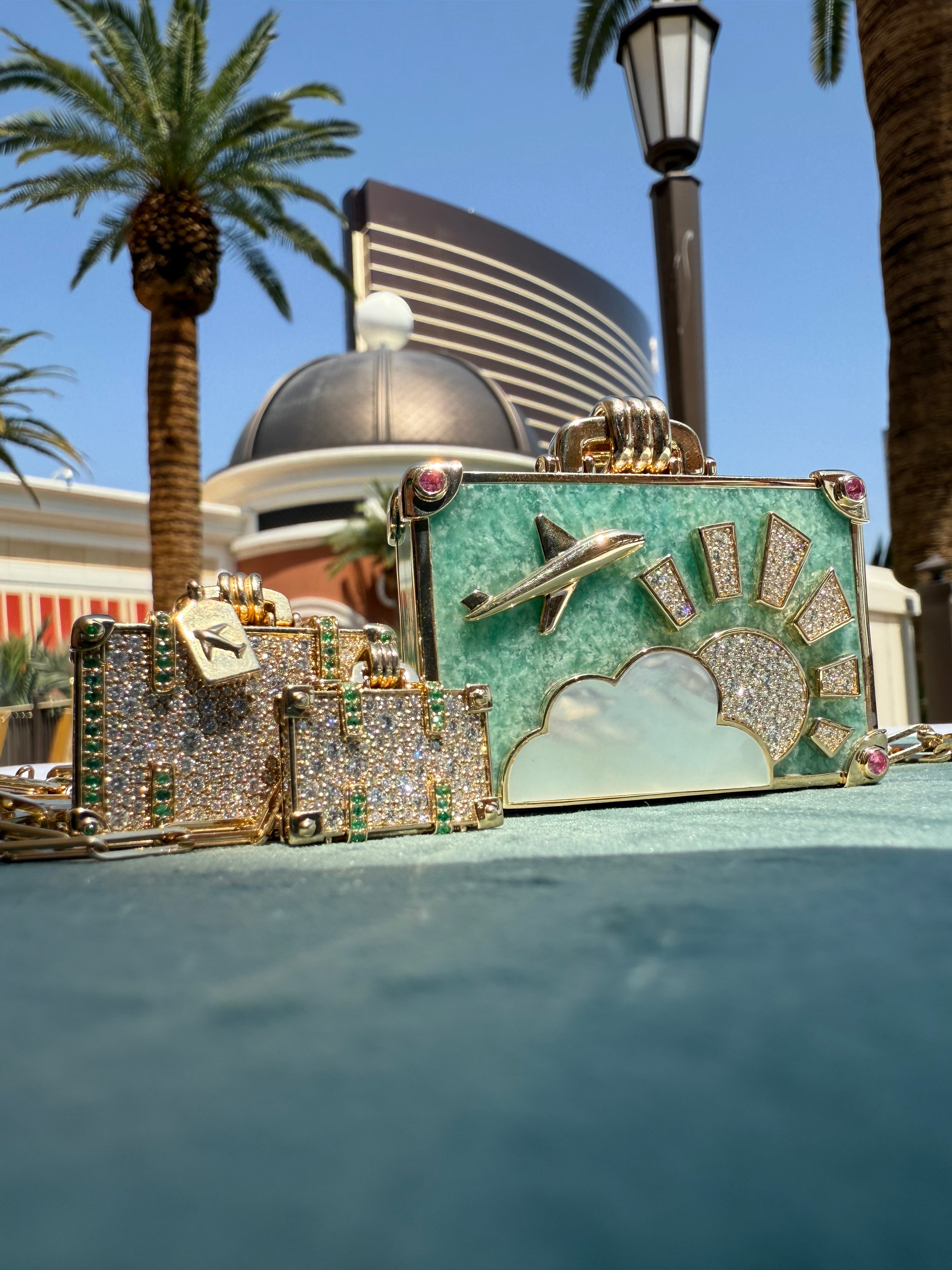 ‘Game Changer’ XL suitcase in 14k yellow gold with diamond pave sun, Amazonite central stone, malachite sides, pink sapphires, and white mother of pearl cloud.