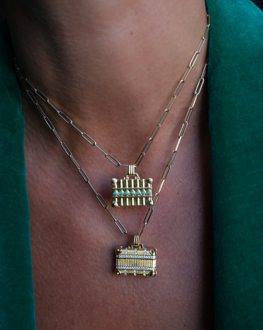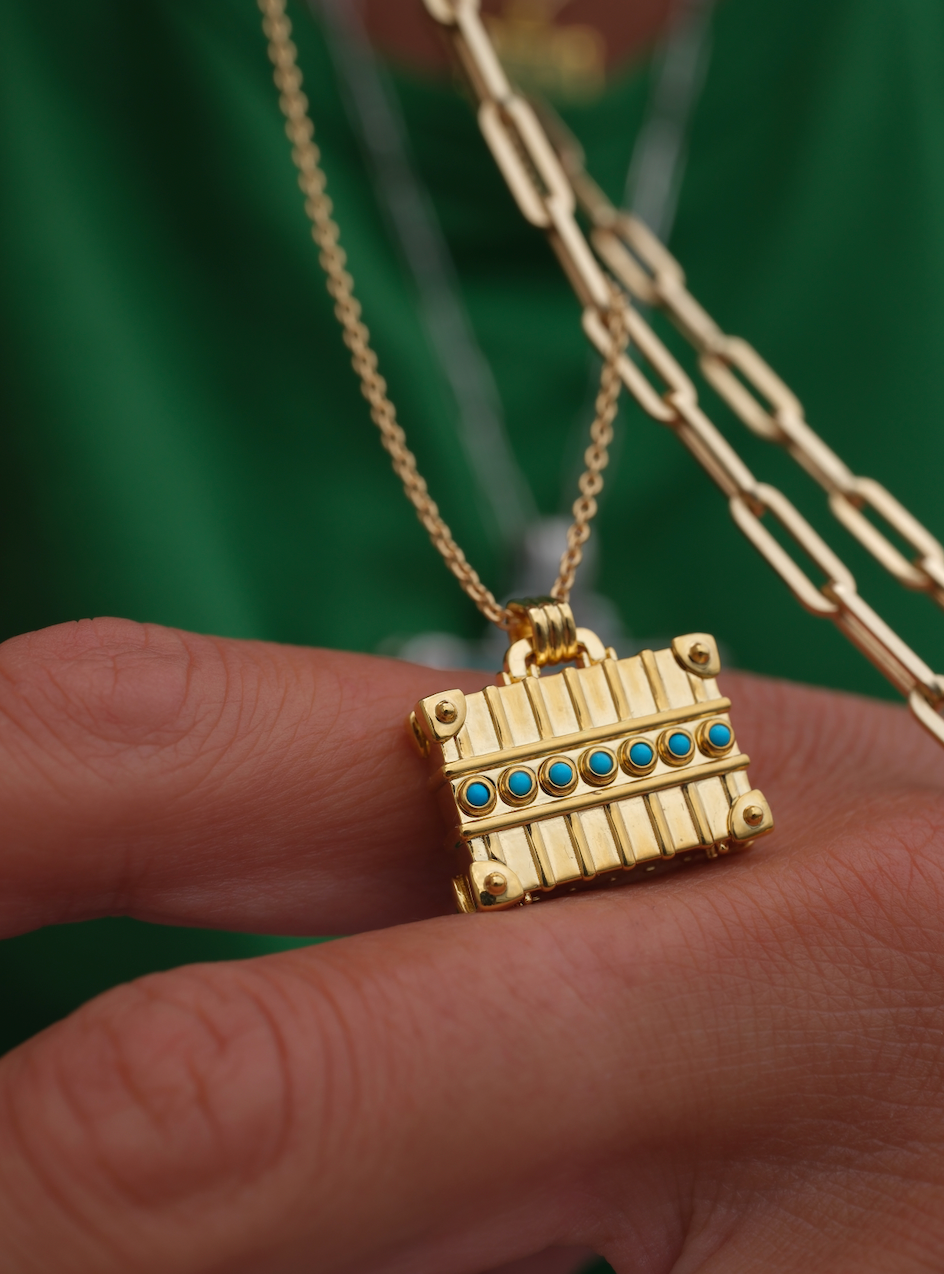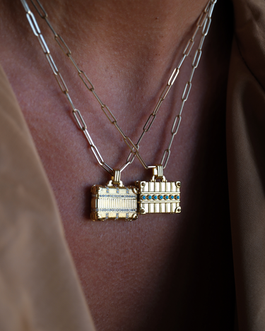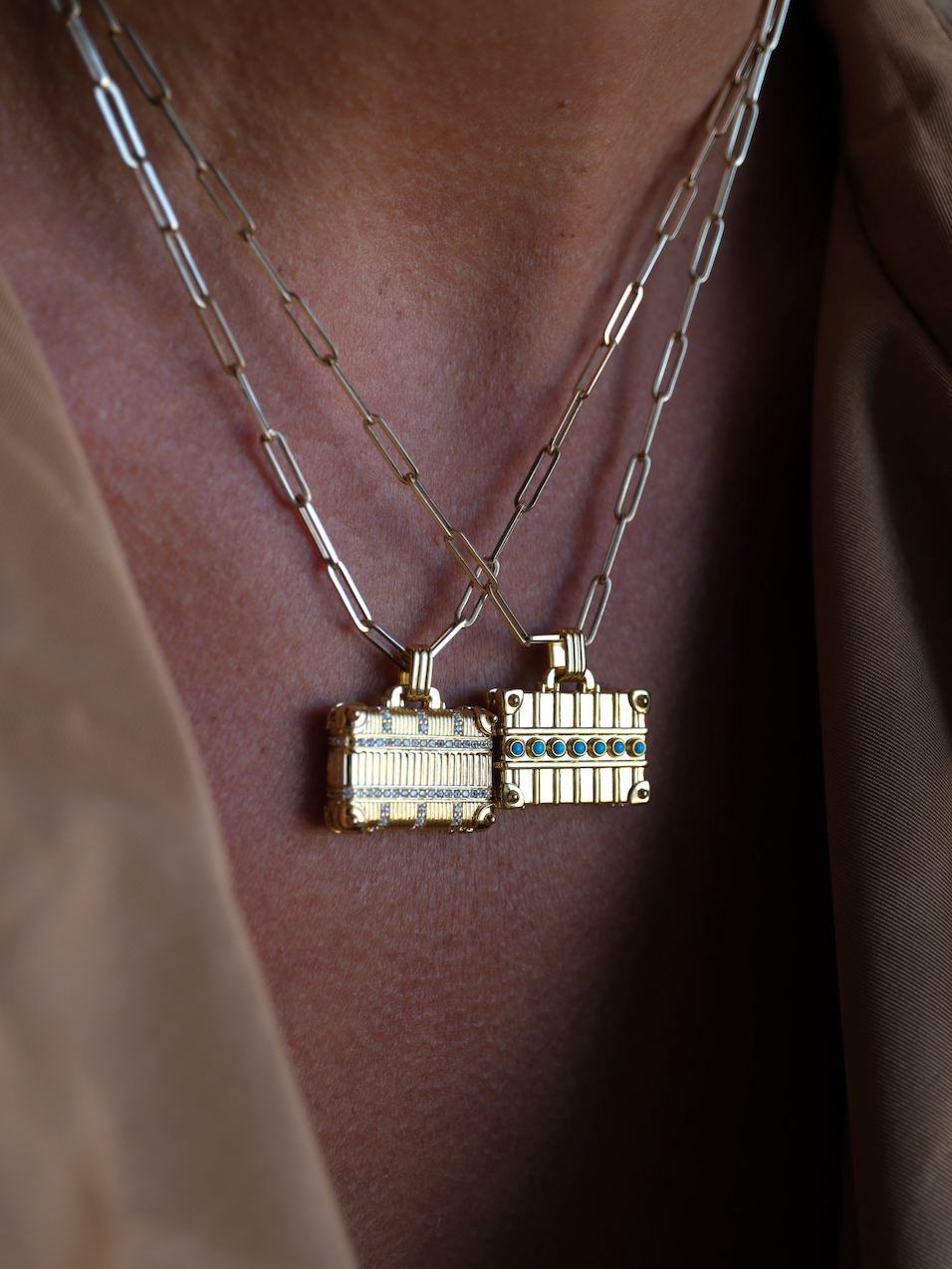 Handcrafted in 14K yellow gold, this suitcase pendant is set with Sleeping Beauty turquoise for a bright, sunlit pop of colour. Suspended from a 42 cm chain, it’s a warm, playful piece made for those who are always chasing the next destination.
