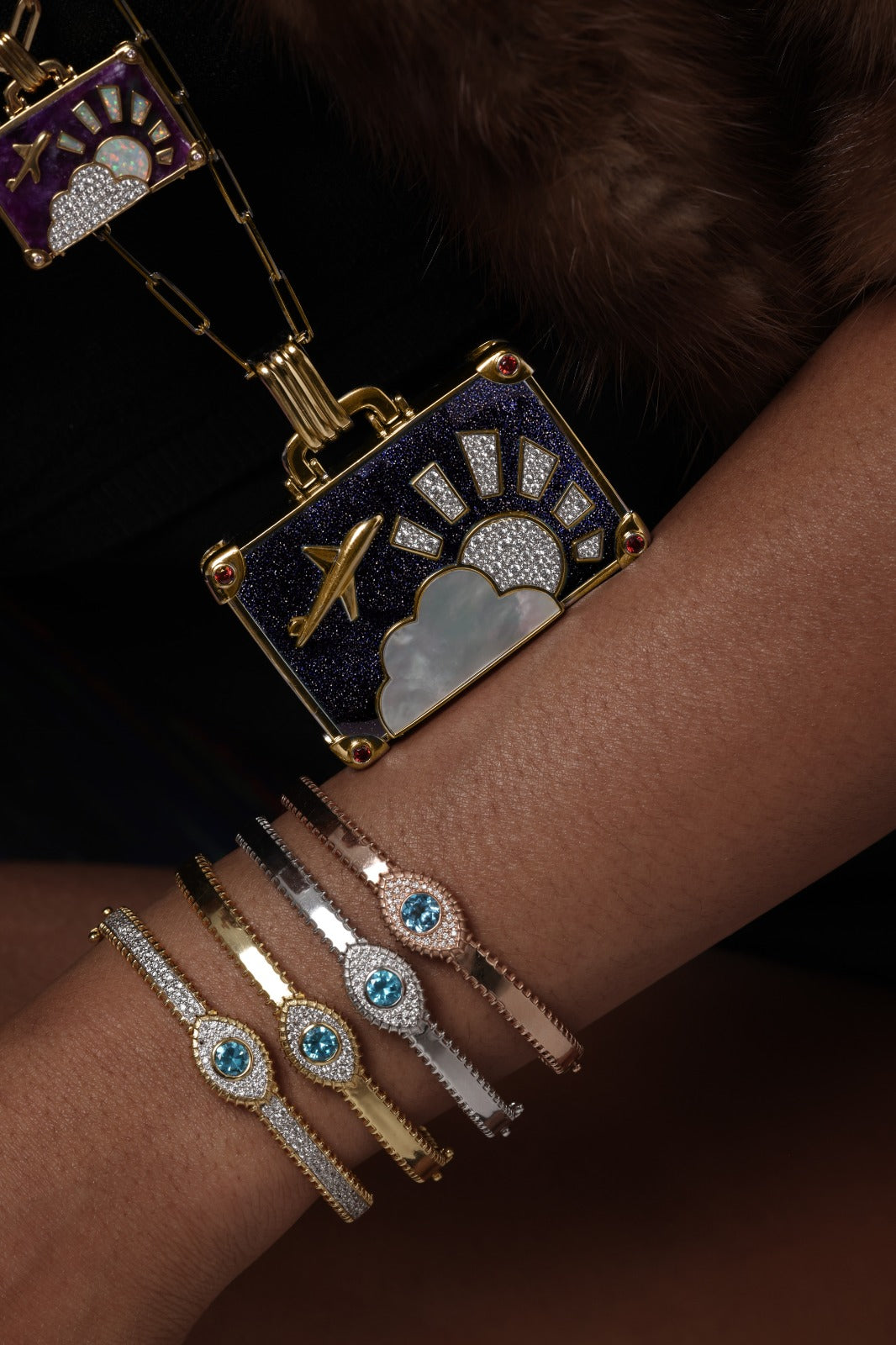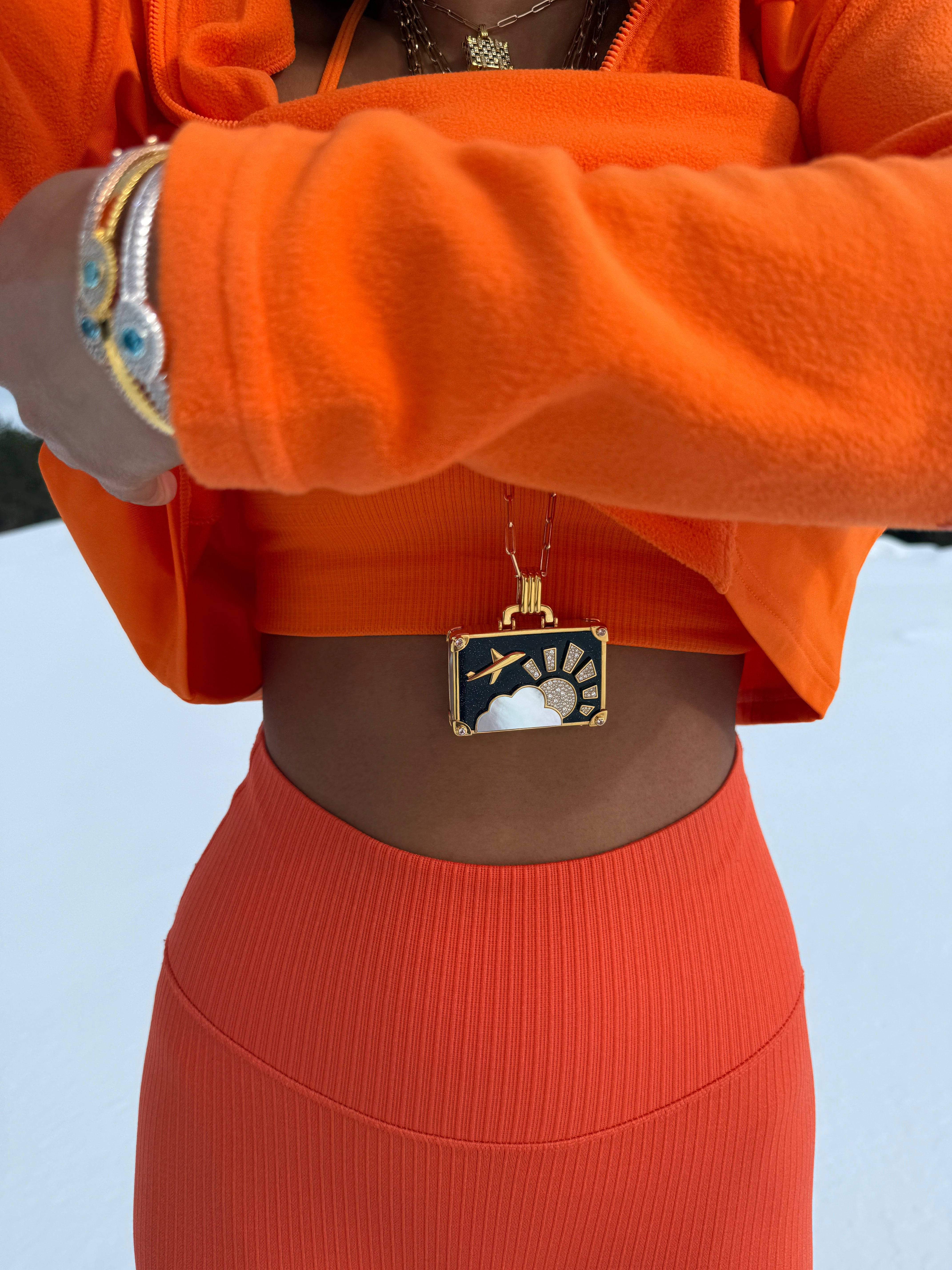 ‘Game Changer’ XL suitcase in 14k yellow gold with diamond pave sun, Blue goldstone central stone, pink sapphires, and white mother of pearl cloud and sides.