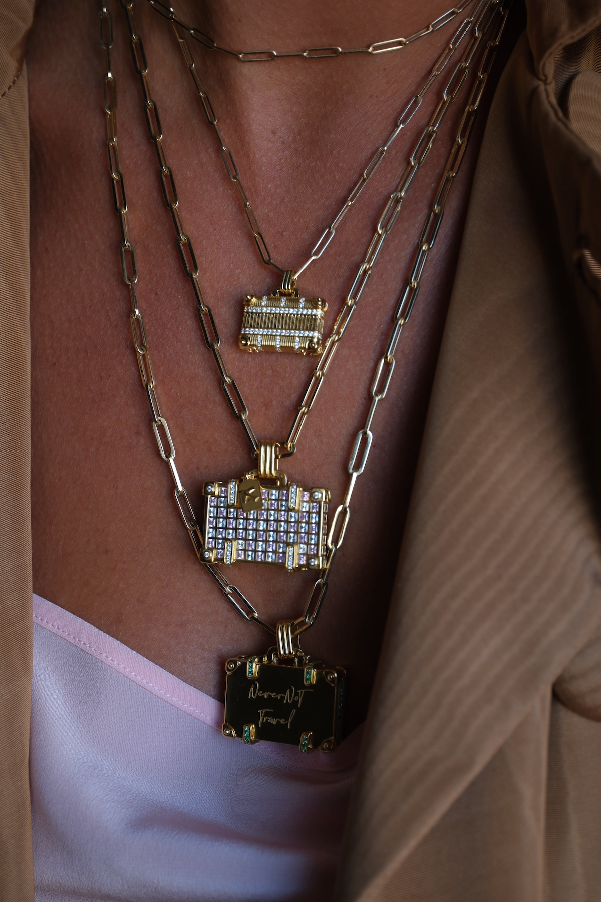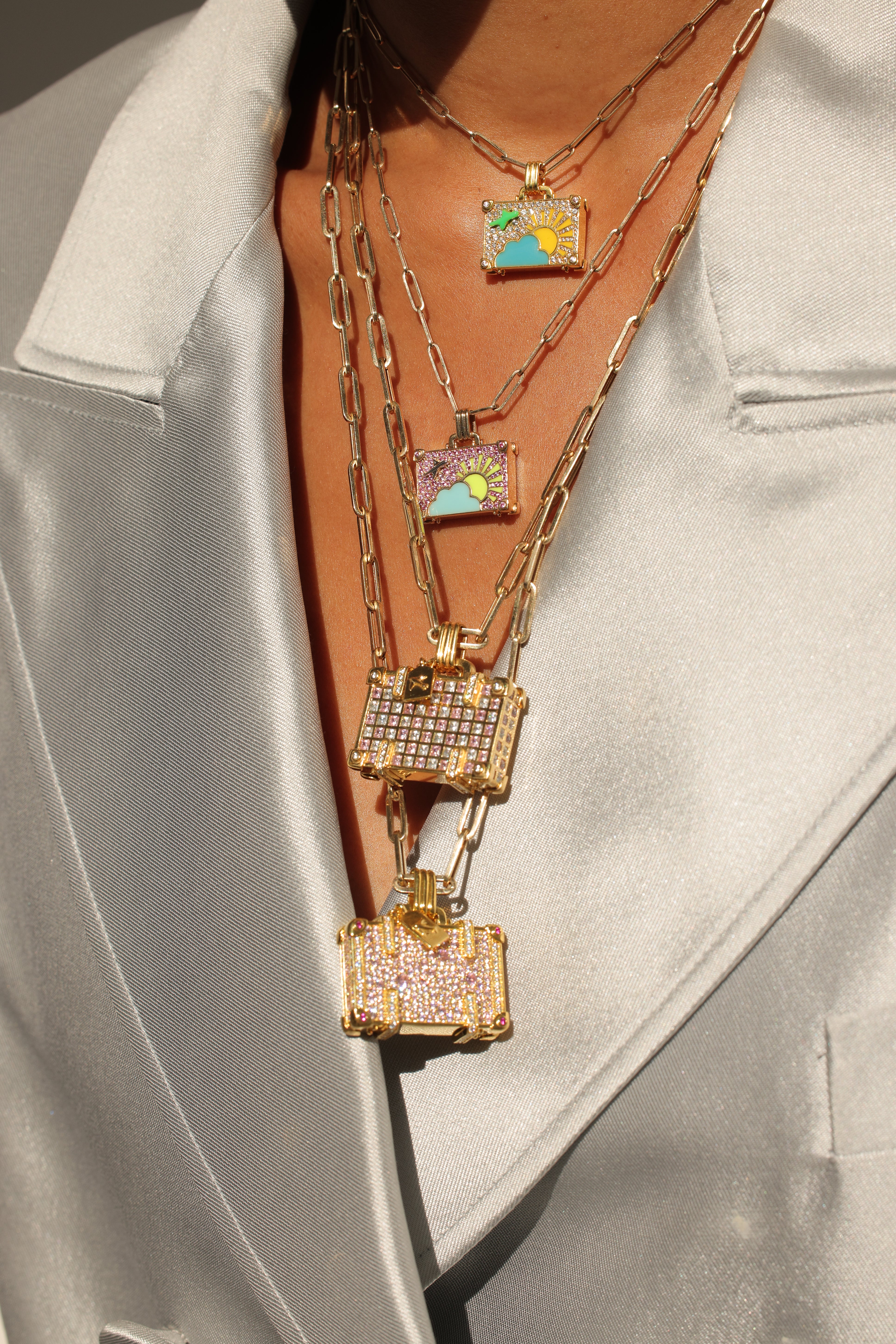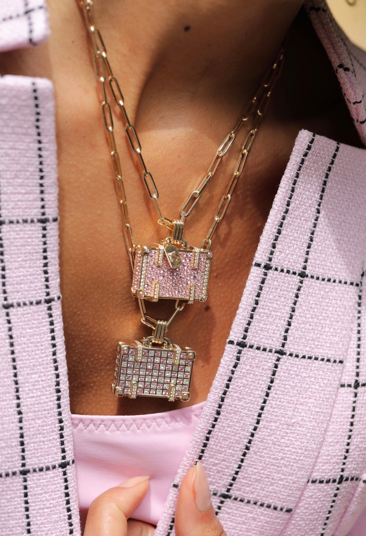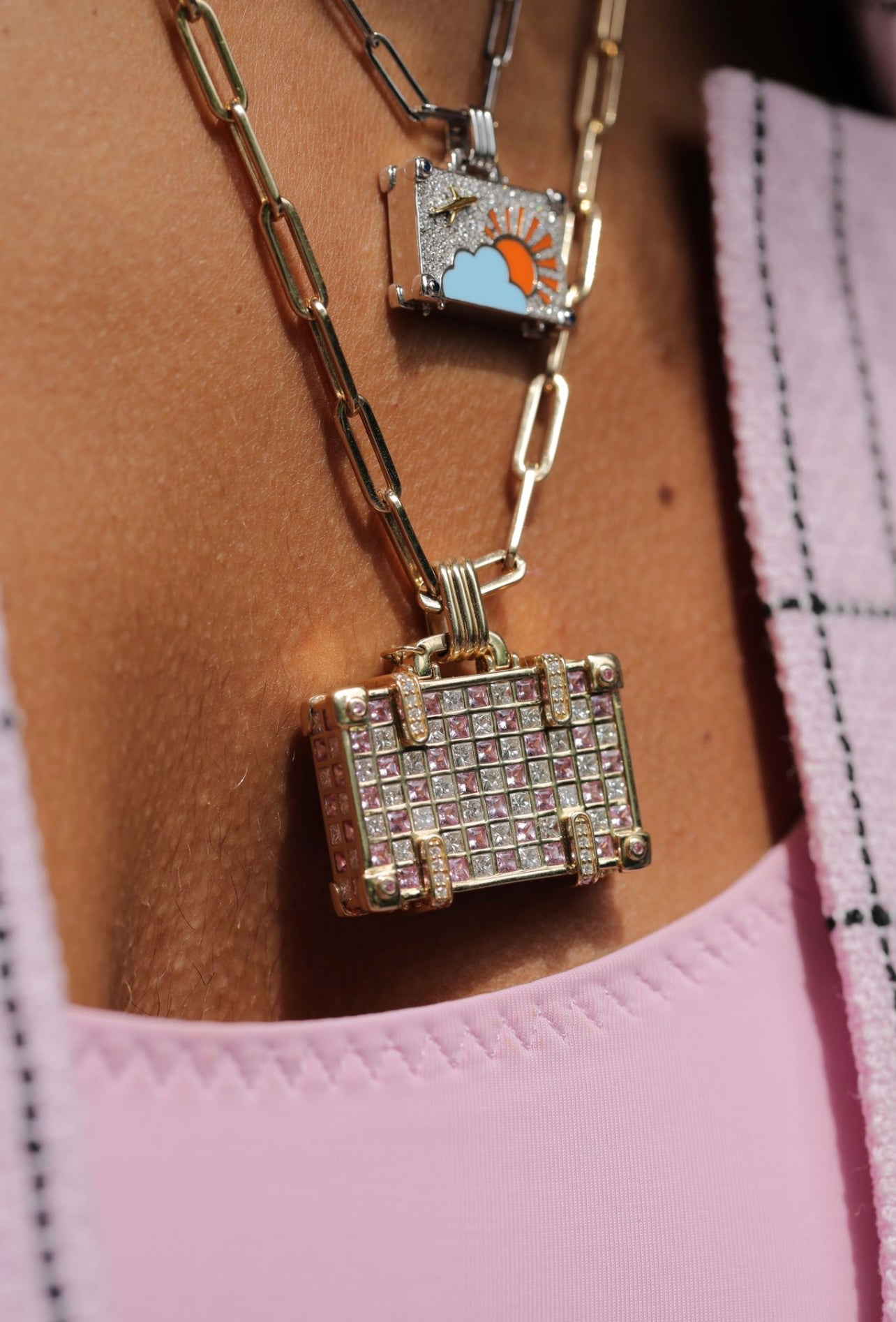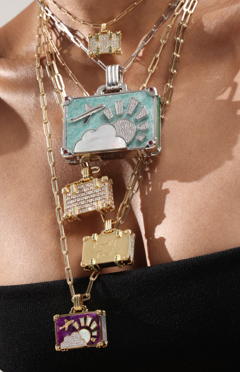 ‘Touch Down’ 14K yellow gold large suitcase with diamonds and pink sapphires.