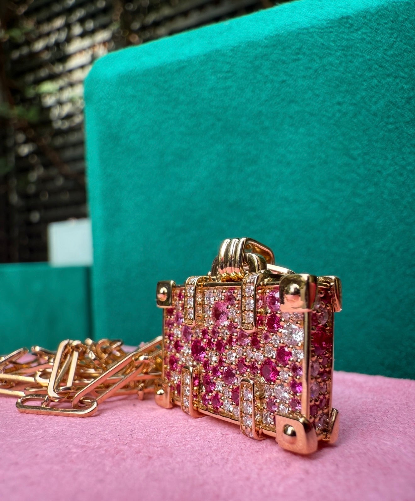 A playful take on fine jewelry, this 14K yellow gold pendant is shaped like a mini suitcase and set with 0.8 ct pink sapphires and 0.55 ct white diamonds. Suspended from a 42 cm chain, it brings a touch of colour and light, perfect for everyday wear and for lovers of summer