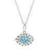 14k gold white gold eye pendant with paraiba, blue sapphires, diamond pave, blue topaz central stone and 42 cm chain.