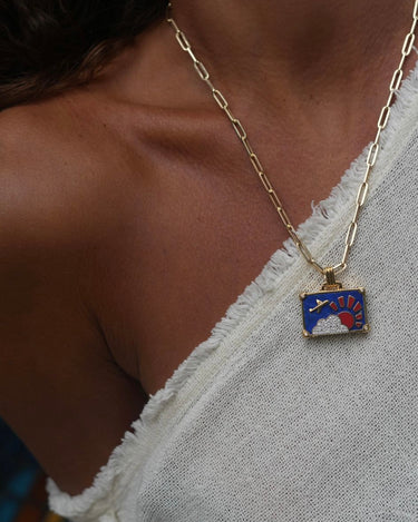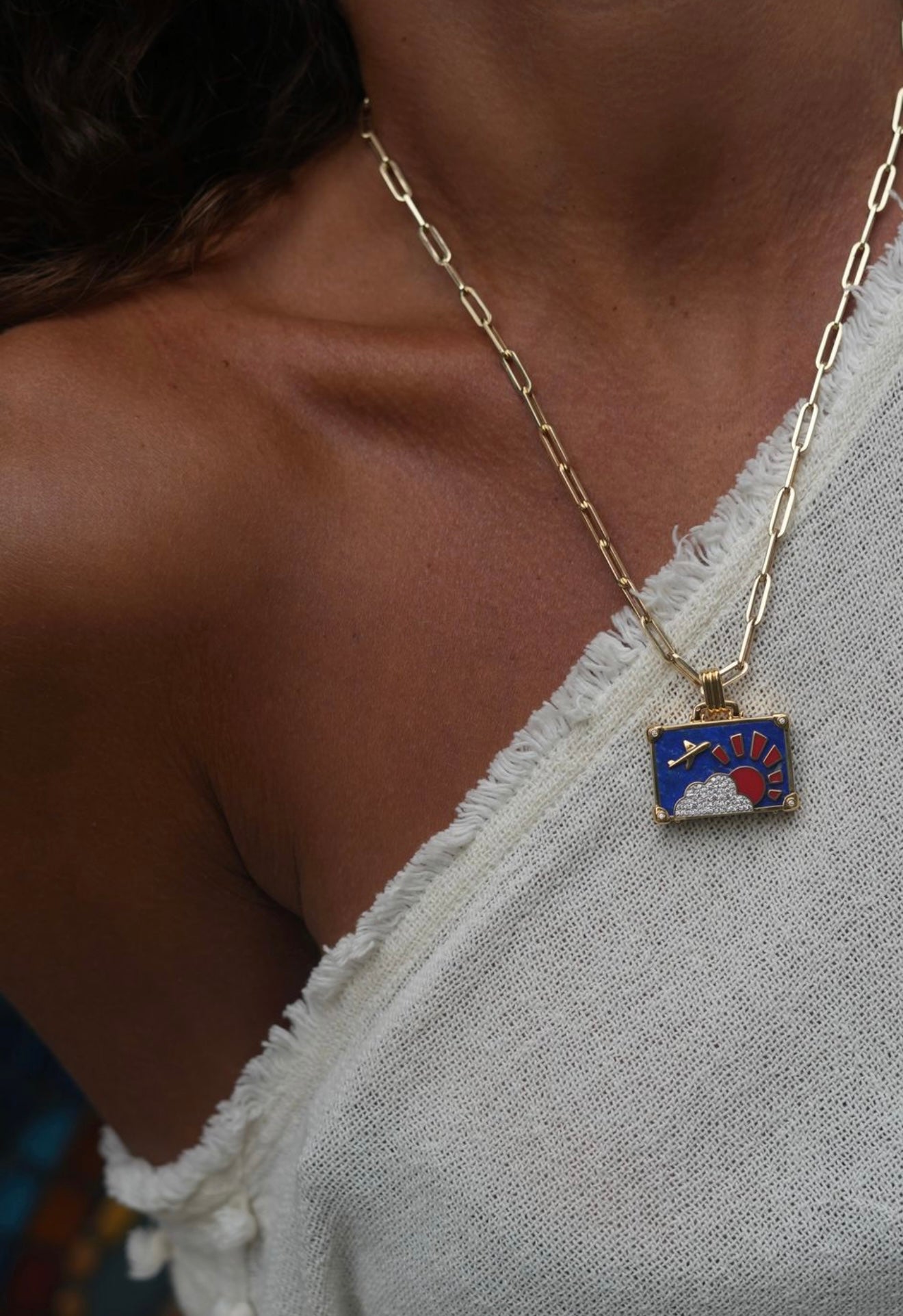 Necklace features lapis lazuli central stone, diamond corners, diamond pave cloud, white mother of pearl sides, red enamel sun and gold airplane.
