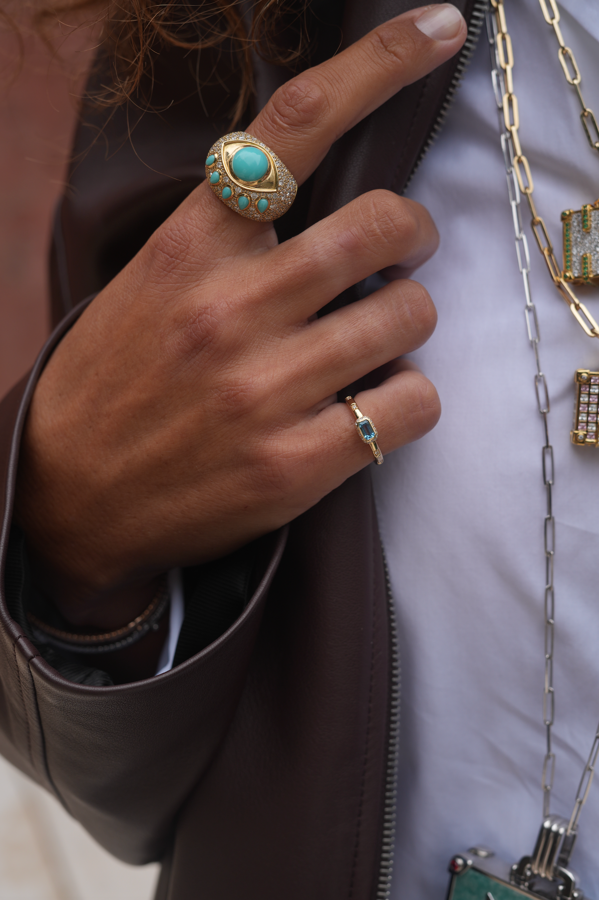 18k gold EYE ring with turquoise stones and full diamond pave.