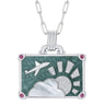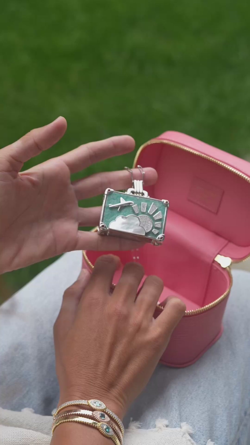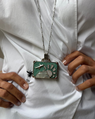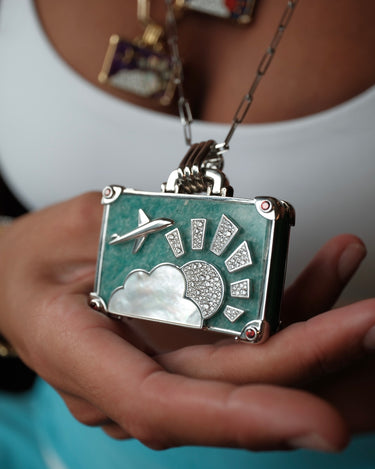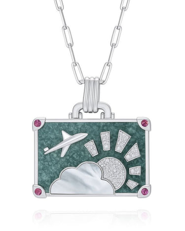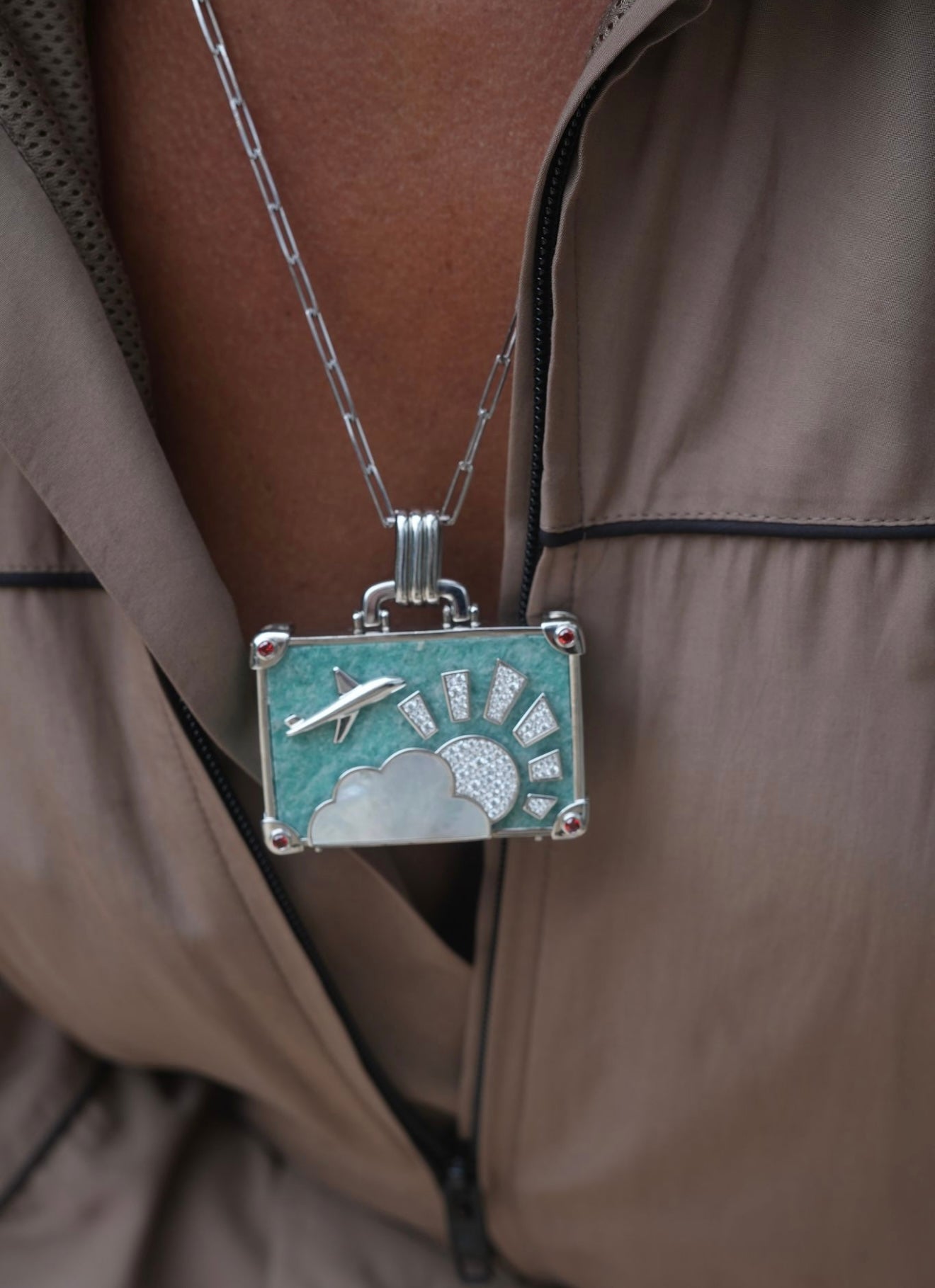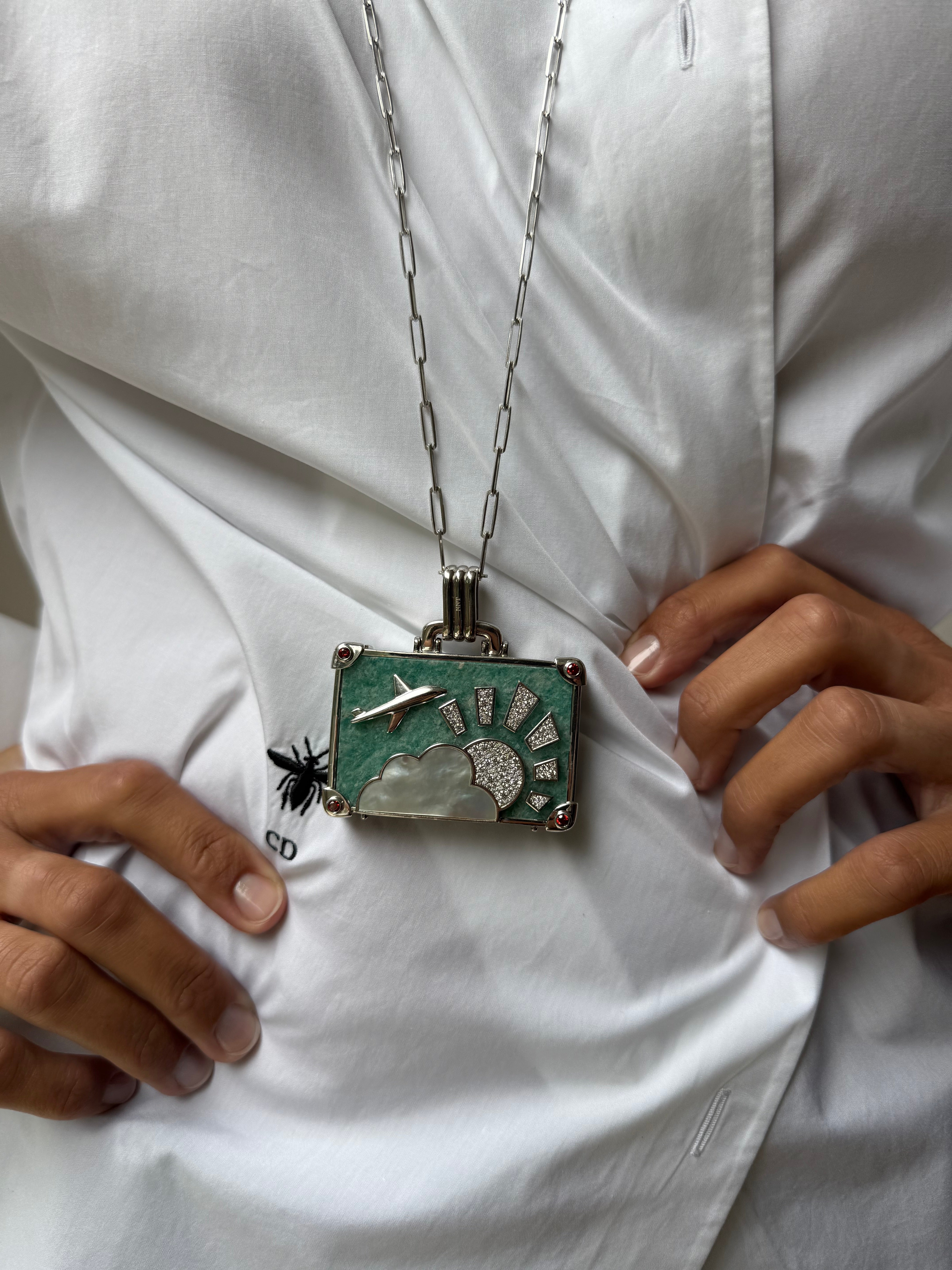 ‘Game Changer’ XL suitcase in 14k white gold with diamond pave sun, Amazonite central stone, malachite sides, pink sapphires, and white mother of pearl cloud.