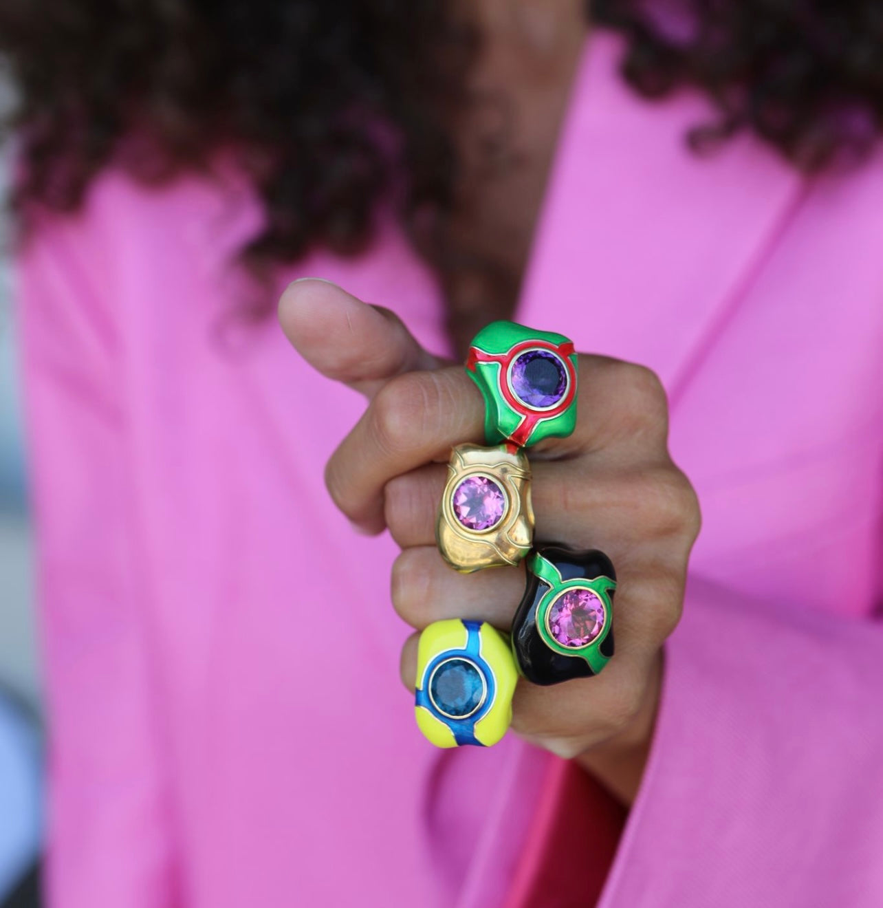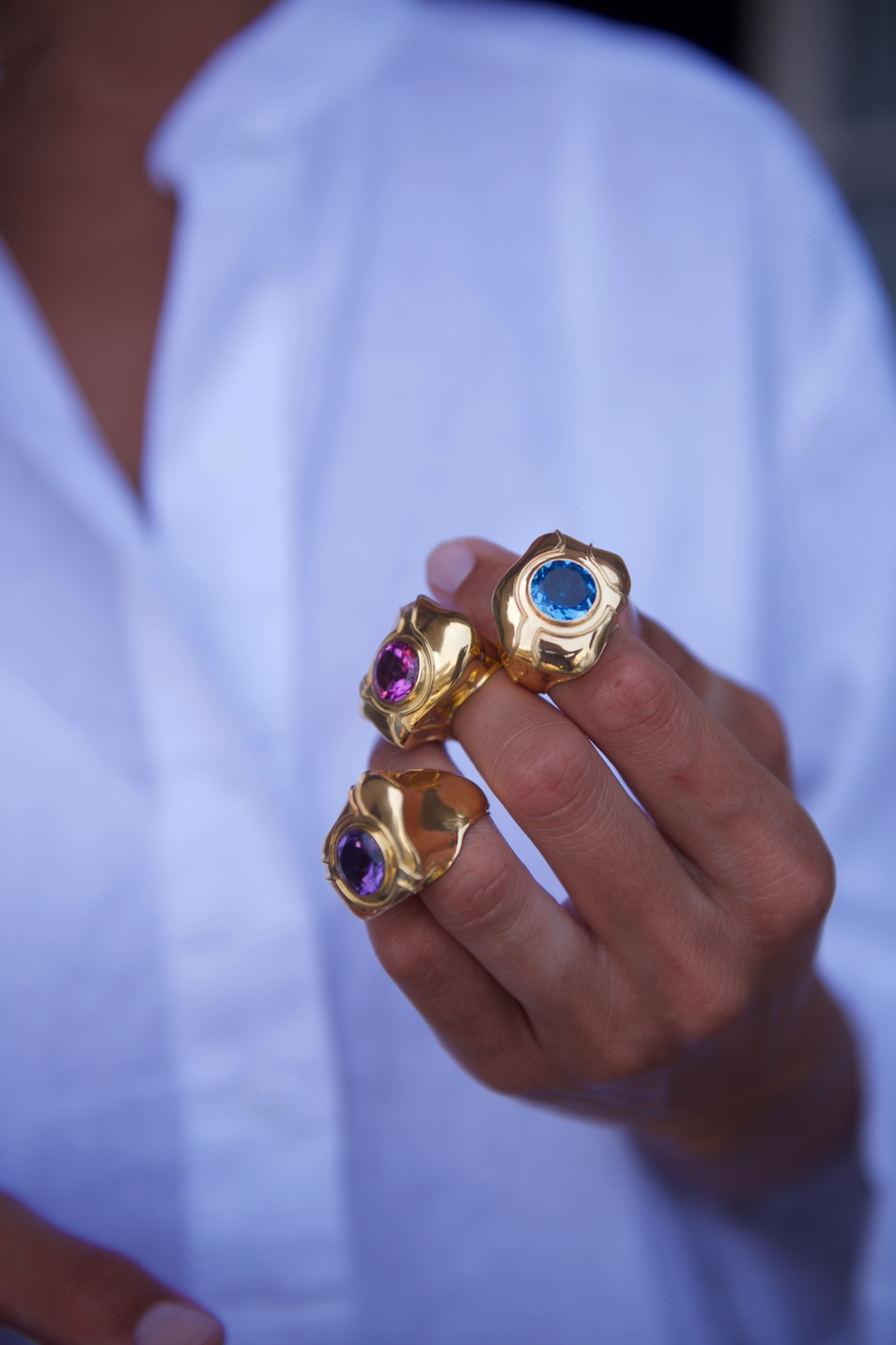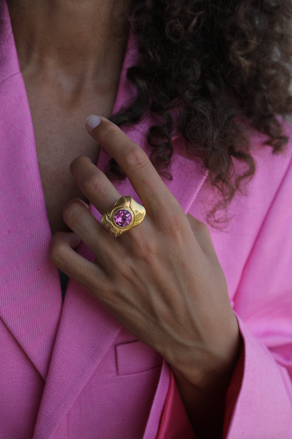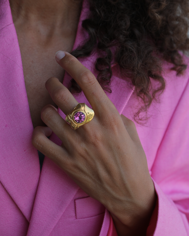 Handcrafted 18k gold ring with pink topaz central stone.