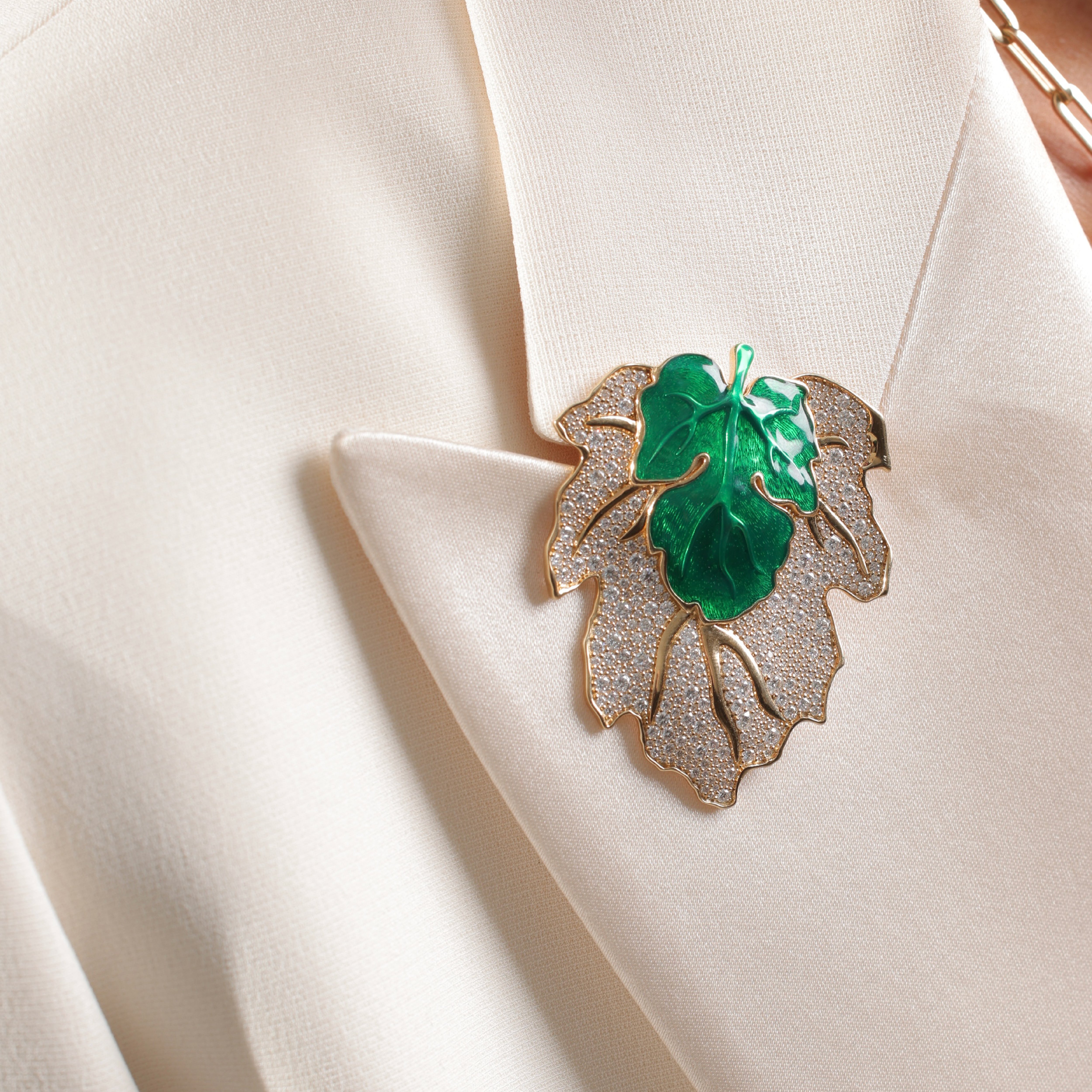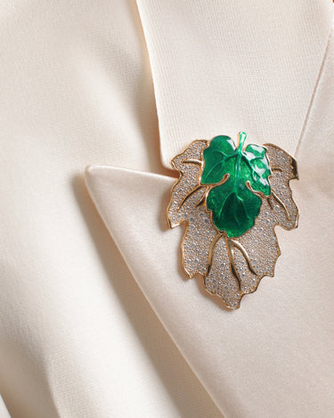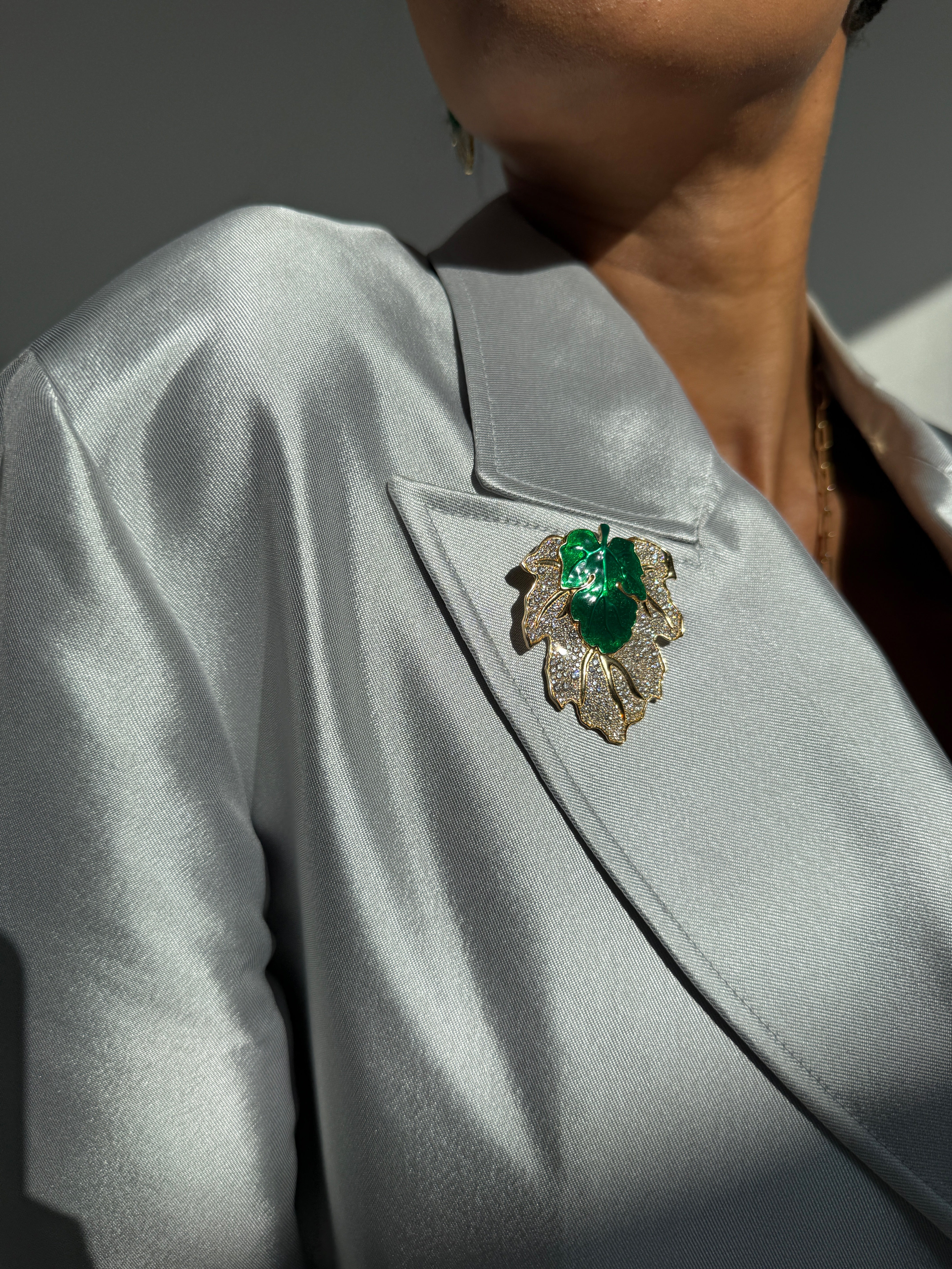 Playful, powerful, and undeniably elegant, the Hide n Seek Ready 2 Lead On brooch captures the spirit of nature through luxury craftsmanship. Sculpted in 18k yellow gold, its bold leaf motif is adorned with 3.44 carats of brilliant white diamonds, flowing like dew across its surface. At the center, a vibrant green enamel overlay adds depth and contrast, creating a wearable piece of art that balances whimsy and authority. Whether worn on a lapel or as a statement pin, this brooch brings organic beauty and commanding style together effortlessly.