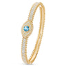 Adorned with 1.028 ct of shimmering white diamonds, its warm tone is brought to life by a radiant 0.8 ct blue topaz at the center.